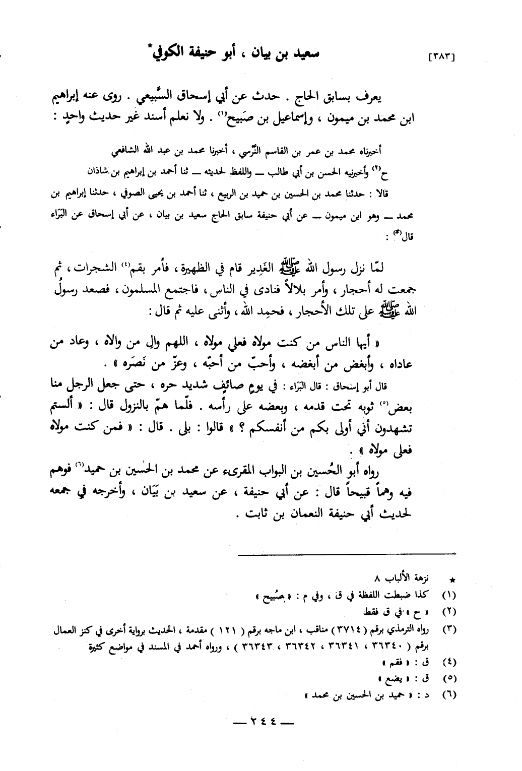 أَخْبَرَنَاهُ مُحَمَّدُ بْنُ عُمَرَ بْنِ الْقَاسِمِ النَّرْسِيُّ، أَخْبَرَنَا مُحَمَّدُ بْنُ عَبْدِ اللَّهِ الشَّافِعِيُّ، ح وَأَخْبَرَنِيهِ الْحَسَنُ بْنُ أَبِي طَالِبٍ، وَاللَّفْظُ لِحَدِيثِهِ، ثَنَا أَحْمَدُ بْنُ إِبْرَاهِيمَ بْنِ شَاذَانَ، قَالا: حَدَّثَنَا مُحَمَّدُ بْنُ الْحُسَيْنِ بْنِ حُمَيْدِ بْنِ الرَّبِيعِ، ثَنَا أَحْمَدُ بْنُ يَحْيَى الصُّوفِيُّ، حَدَّثَنَا إِبْرَاهِيمُ بْنُ مُحَمَّدٍ، وَهُوَ ابْنُ مَيْمُونٍ، عَنْ أَبِي حَنِيفَةَ سَابِقِ الْحَاجِّ سَعِيدِ بْنِ بَيَانٍ، عَنْ أَبِي إِسْحَاقَ، عَنِ الْبَرَاءِ، قَالَ: لَمَّا نَزَلَ رَسُولُ اللَّهِ صَلَّى اللَّهُ عَلَيْهِ وَسَلَّمَ الْغَدِيرَ قَامَ فِي الظَّهِيرَةِ، فَأَمَرَ بِقَمِّ الشَّجَرَاتِ، ثُمَّ جُمِعَتْ لَهُ أَحْجَارٌ، وَأَمَرَ بِلالا فَنَادَى فِي النَّاسِ، فَاجْتَمَعَ الْمُسْلِمُونَ، فَصَعَدَ رَسُولُ اللَّهِ صَلَّى اللَّهُ عَلَيْهِ وَسَلَّمَ عَلَى تِلْكَ الأَحْجَارِ، فَحَمِدَ اللَّهَ، وَأَثْنَى عَلَيْهِ، ثُمَّ قَالَ: «أَيُّهَا النَّاسُ، مَنْ كُنْتُ مَوْلاهُ فَعَلَيَّ مَوْلاهُ، اللَّهُمَّ وَالِ مَنْ وَالاهُ، وَعَادِ مَنْ عَادَاهُ، وَأَبْغِضْ مَنْ أَبْغَضَهُ، وَأَحِبَّ مَنْ أَحَبَّهُ، وَأَعِزَّ مَنْ نَصَرَهُ»، قَالَ أَبُو إِسْحَاقَ: قَالَ الْبَرَاءُ: فِي يَوْمٍ صَائِفٍ شَدِيدٍ حَرِّهِ، حَتَّى جَعَلَ الرَّجُلُ مِنَّا بَعْضَ ثَوْبِهِ تَحْتَ قَدَمِهِ، وَبَعْضَهُ عَلَى رَأْسِهِ، فَلَمَّا هَمَّ بِالنُّزُولِ قَالَ: «أَلَسْتُمْ تَشْهَدُونَ أَنِّي أَوْلَى بِكُمْ مِنْ أَنْفُسِكُمْ؟» قَالُوا: بَلَى، قَالَ: «فَمَنْ كُنْتُ مَوْلاهُ فَعَلَيَّ مَوْلاهُ»، رَوَاهُ أَبُو الْحُسْيَنِ بْنُ الْبَوَّابِ الْمُقْرِئُ، عَنْ مُحَمَّدِ بْنِ الْحُسَيْنِ بْنِ حُمَيْدٍ فَوَهِمَ فِيهِ وَهْمًا قَبِيحًا قَالَ: عَنْ أَبِي حَنِيفَةَ،