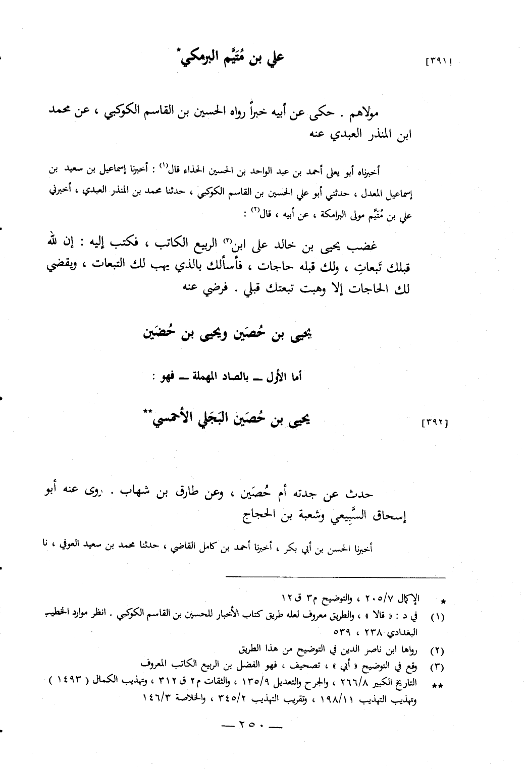أَخْبَرَنَاهُ أَبُو يَعْلَى أَحْمَدُ بْنُ عَبْدِ الْوَاحِدِ بْنِ الْحُسَيْنِ الْحَذَّاءُ، قَالَ: أَخْبَرَنَا إِسْمَاعِيلُ بْنُ سَعِيدِ بْنِ إِسْمَاعِيلَ الْمُعَدِّلُ، حَدَّثَنِي أَبُو عَلِيٍّ الْحُسَيْنُ بْنُ الْقَاسِمِ الْكَوْكَبِيُّ، حَدَّثَنَا مُحَمَّدُ بْنُ الْمُنْذِرِ الْعَبْدِيُّ، أَخْبَرَنِي عَلِيُّ بْنُ مُتَيَّمٍ مَوْلَى الْبَرَامِكَةِ، عَنْ أَبِيهِ، قَالَ: " غَضِبَ يَحْيَى بْنُ خَالِدٍ عَلَى ابْنِ الرَّبِيعِ الْكَاتِبِ، فَكَتَبَ إِلَيْهِ: إِنَّ لِلَّهِ قِبَلَكَ تَبِعَاتٍ: وَلَكَ قِبَلَهُ حَاجَاتٍ، فَأَسْأَلُكَ بِالَّذِي يَهِبُ لَكَ التَّبِعَاتِ، وَيَقْضِي لَكَ الْحَاجَاتِ إِلا وَهَبْتَ تَبِعَتَكَ قِبَلِي، فَرَضِيَ عَنْهُ "