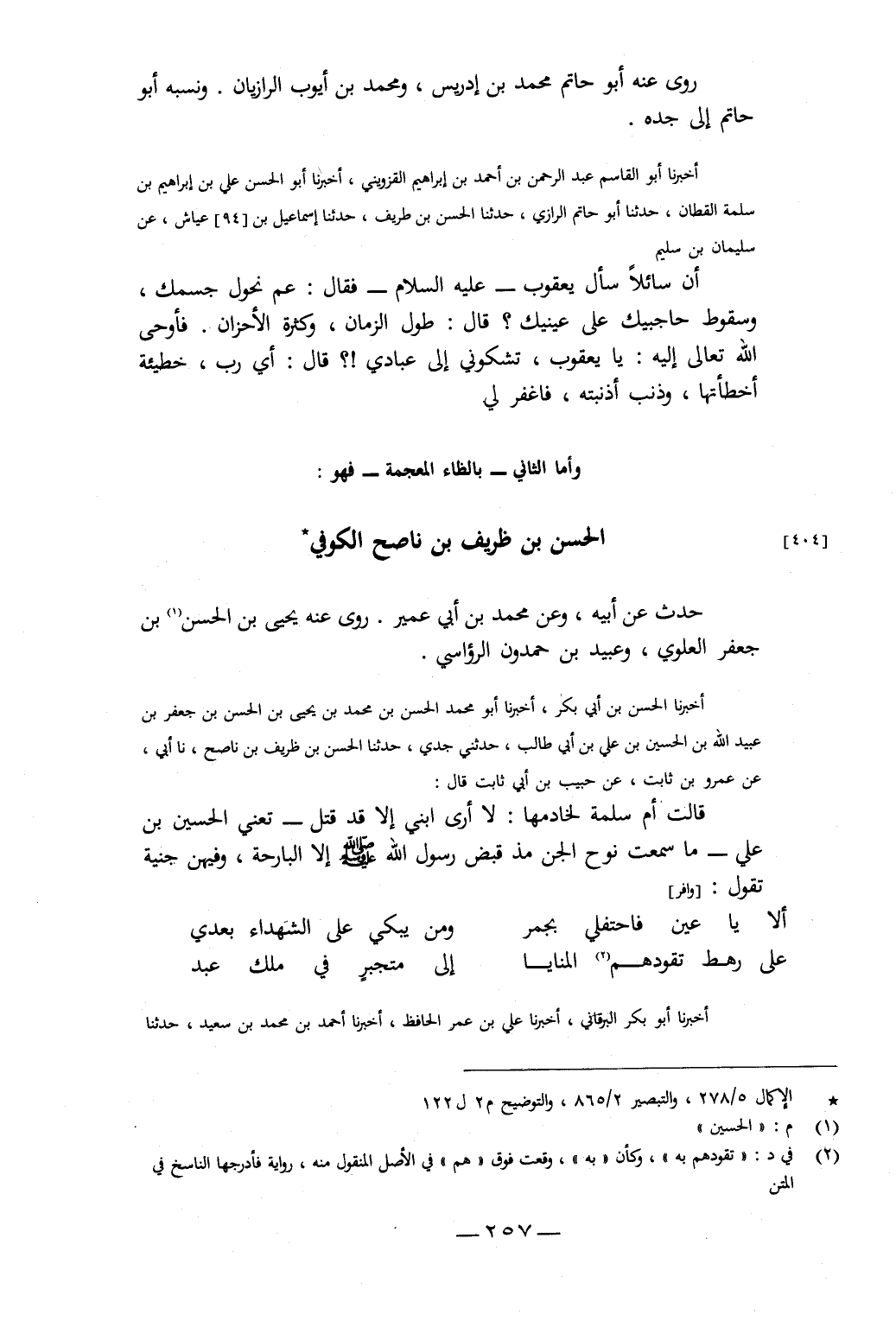 أَخْبَرَنَا أَبُو الْقَاسِمِ عَبْدُ الرَّحْمَنِ بْنُ أَحْمَدَ بْنِ إِبْرَاهِيمَ الْقَزْوِينِيُّ، أَخْبَرَنَا أَبُو الْحَسَنِ عَلِيُّ بْنُ إِبْرَاهِيمَ بْنِ سَلَمَةَ الْقَطَّانُ، حَدَّثَنَا أَبُو حَاتِمٍ الرَّازِيُّ، حَدَّثَنَا الْحَسَنُ بْنُ طَرِيفٍ، حَدَّثَنَا إِسْمَاعِيلُ بْنُ عَيَّاشٍ، عَنْ سُلَيْمَانَ بْنِ سَلِيمٍ: " أَنَّ سَائِلا سَأَلَ يَعْقُوبَ عَلَيْهِ السَّلامُ، فَقَالَ: عَمَّ نُحُولُ جِسْمِكَ، وَسُقُوطُ حَاجِبَيْكَ عَلَى عَيْنَيْكَ؟ قَالَ: طُولُ الزَّمَانِ، وَكَثْرَةُ الأَحْزَانِ، فَأَوْحَى اللَّهُ تَعَالَى إِلَيْهِ: يَا يَعْقُوبُ، تَشْكُونِي إِلَى عِبَادِي، قَالَ: أَيَّ رَبُّ، خَطِيئَةٌ أَخْطَأْتُهَا، وَذَنْبٌ أَذْنَبْتُهُ، فَاغْفِرْ لِي "