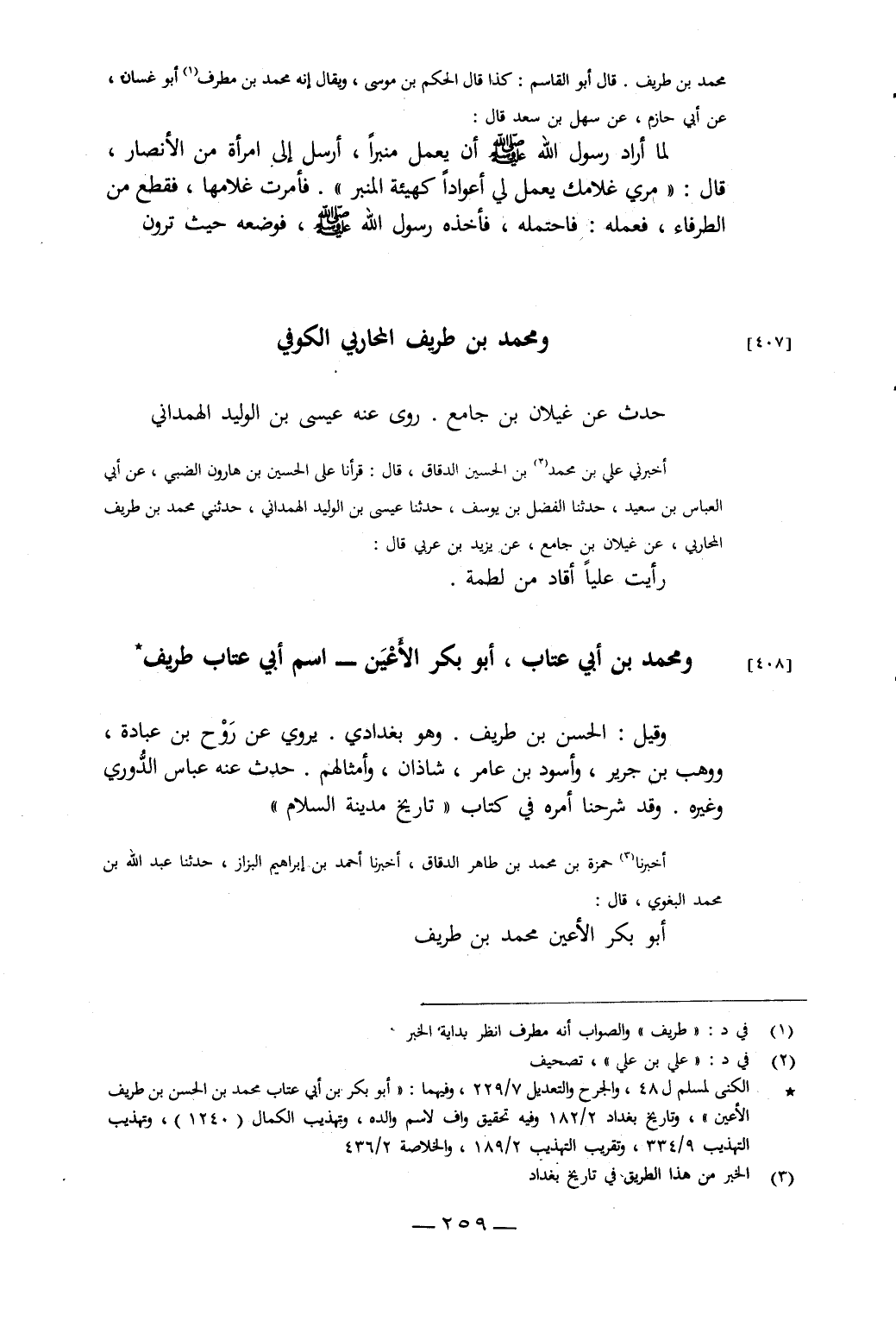 أَخْبَرَنَا حَمْزَةُ بْنُ مُحَمَّدِ بْنِ طَاهِرٍ الدَّقَّاقُ، أَخْبَرَنَا أَحْمَدُ بْنُ إِبْرَاهِيمَ الْبَزَّازُ، حَدَّثَنَا عَبْدُ اللَّهِ بْنُ مُحَمَّدٍ الْبَغَوِيُّ، قَالَ: أَبُو بَكْرٍ الأَعْيَنُ: مُحَمَّدُ بْنُ طَرِيفٍ