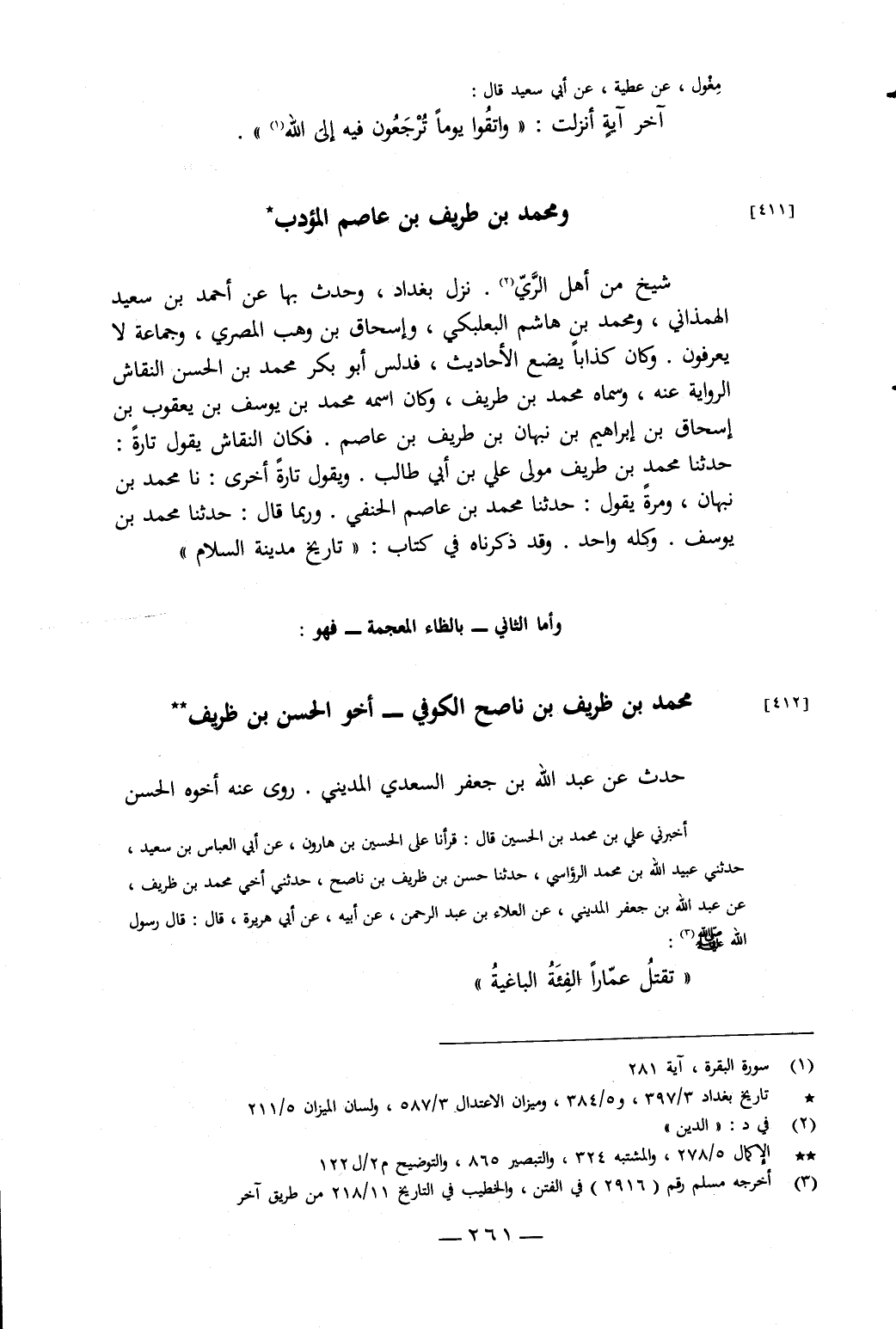 أَخْبَرَنِي عَلِيُّ بْنُ مُحَمَّدِ بْنِ الْحُسَيْنِ، قَالَ: قَرَأْنَا عَلَى الْحُسَيْنِ بْنِ هَارُونَ، عَنْ أَبِي الْعَبَّاسِ بْنِ سَعِيدٍ، حَدَّثَنِي عُبَيْدُ اللَّهِ بْنُ مُحَمَّدٍ الرُّؤَاسِيُّ، حَدَّثَنَا حَسَنُ بْنُ ظَرِيفِ بْنِ نَاصِحٍ، حَدَّثَنِي أَخِي مُحَمَّدُ بْنُ ظَرِيفٍ، عَنْ عَبْدِ اللَّهِ بْنِ جَعْفَرٍ الْمَدِينِيِّ، عَنِ الْعَلاءِ بْنِ عَبْدِ الرَّحْمَنِ، عَنْ أَبِيهِ، عَنْ أَبِي هُرَيْرَةَ، قَالَ: قَالَ رَسُولُ اللَّهِ صَلَّى اللَّهُ عَلَيْهِ وَسَلَّمَ: «تَقْتُلُ عَمَّارًا الْفِئَةُ الْبَاغِيَةُ»