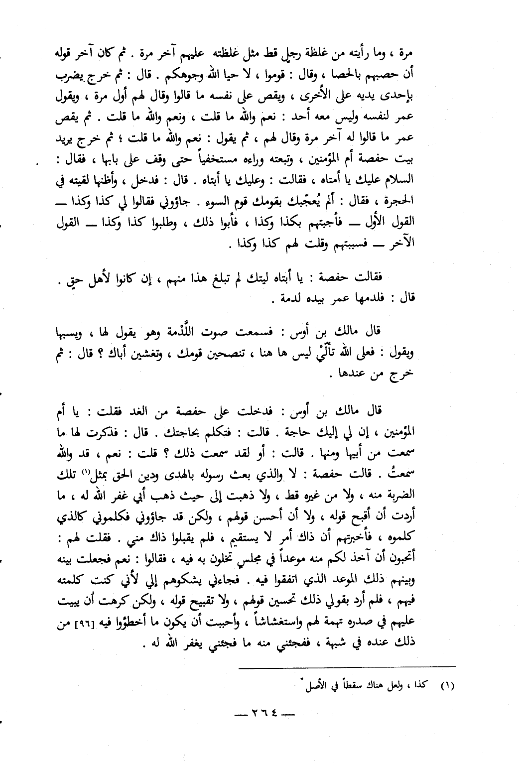 مَرَّةٍ، وَمَا رَأَيْتُ مِنْ غِلْظَةِ رَجُلٍ قَطُّ مِثْلِ غِلْظَتِهِ عَلَيْهِمْ آخِرِ مَرَّةٍ، ثُمَّ كَانَ آخِرُ قَوْلِهِ أَنْ حَصَبَهُمْ بِالْحَصَا، وَقَالَ: قُومُوا، لا حَيَّا اللَّهُ وُجُوهَكُمْ، قَالَ: ثُمَّ خَرَجَ يَضْرِبُ بِإِحْدَى يَدَيْهِ عَلَى الأُخْرَى وَيَقُصُّ عَلَى نَفْسِهِ مَا قَالُوا، وَقَالَ لَهُمْ أَوَّلَ مَرَّةٍ، وَيَقُولُ عُمَرُ لِنَفْسِهِ وَلَيْسَ مَعَهُ أَحَدٌ: نَعَمْ وَاللَّهِ مَا قُلْتُ، وَنَعَمْ وَاللَّهِ مَا قُلْتُ، ثُمَّ يَقُصُّ عُمَرُ مَا قَالُوا لَهُ آخِرَ مَرَّةٍ وَقَالَ لَهُمْ، ثُمَّ يَقُولُ: نَعَمْ وَاللَّهِ مَا قُلْتُ، ثُمَّ خَرَجَ يُرِيدُ بَيْتَ حَفْصَةَ أُمِّ الْمُؤْمِنِينَ، وَتَبِعْتُهُ وَرَاءَهُ مُسْتَخْفِيًا حَتَّى وَقَفَ عَلَى بَابِهَا، فَقَالَ: السَّلامُ عَلَيْكِ يَا أُمَّتَاهُ، فَقَالَتْ: وَعَلَيْكَ يَا أَبَتَاهُ، قَالَ: فَدَخَلَ، وَأَظُنُّهَا لَقِيَتْهُ فِي الْحُجْرَةِ، فَقَالَ: أَلَمْ يُعْجِبْكِ بِقَوْمِكِ قَوْمَ السُّوءِ، جَاءُونِي فَقَالُوا لِي كَذَا وَكَذَا، الْقَوْلُ الأَوَّلُ، فَأَجَبْتُهُمْ بِكَذَا وَكَذَا، فَأَبَوْا ذَلِكَ، وَطَلَبُوا كَذَا وَكَذَا، الْقَوْلُ الآخَرُ، فَسَبَبْتُهُمْ وَقُلْتُ لَهُمْ كَذَا وَكَذَا، فَقَالَتْ حَفْصَةُ: يَا أَبَتَاهُ لَيْتَكَ لَمْ تَبْلُغْ هَذَا مِنْهُمْ، إِنْ كَانُوا لأَهْلَ حَقٍّ، قَالَ: فَلَدَمَهَا عُمَرُ بِيَدِهِ لَدْمَةً، قَالَ مَالِكُ بْنُ أَوْسٍ: فَسَمِعْتُ صَوْتَ اللَّدْمَةِ وَهُوَ يَقُولُ لَهَا، وَيَسُبُّهَا وَيَقُولُ: فَعَلَى اللَّهِ تَأَلِّي لَيْسَ