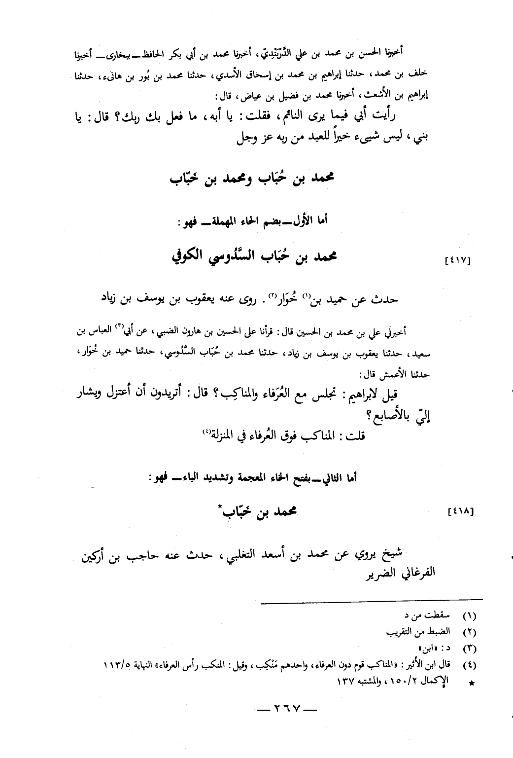 أَخْبَرَنِي عَلِيُّ بْنُ مُحَمَّدِ بْنِ الْحُسَيْنِ، قَالَ: قَرَأْنَا عَلَى الْحُسَيْنِ بْنِ هَارُونَ الضَّبِّيِّ، عَنْ أَبِي الْعَبَّاسِ بْنِ سَعِيدٍ، حَدَّثَنَا يَعْقُوبُ بْنُ يُوسُفَ بْنِ زِيَادٍ، حَدَّثَنَا مُحَمَّدُ بْنُ حُبَابٍ السَّدُوسِيُّ، حَدَّثَنَا حُمَيْدُ بْنُ خُوَارٍ، حَدَّثَنَا الأَعْمَشُ، قَالَ: قِيلَ لإِبْرَاهِيمَ: تَجْلِسُ مَعَ الْعُرَفَاءِ وَالْمَنَاكِبِ، قَالَ: أَتُرِيدُونَ أَنْ أَعْتَزِلَ وَيُشَارُ إِلَيَّ بِالأَصَابِعِ؟ قُلْتُ: الْمَنَاكِبُ فَوْقَ الْعُرَفَاءِ فِي الْمَنْزِلَةِ أَمَّا الثَّانِي بِفَتْحِ الْخَاءِ الْمُعْجَمَةِ وَتَشْدِيدِ الْبَاءِ فَهُوَ: