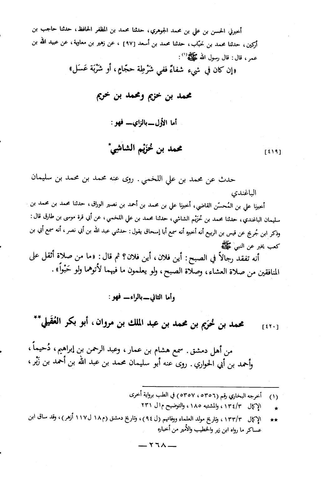 أَخْبَرَنِي الْحَسَنُ بْنُ عَلِيِّ بْنِ مُحَمَّدٍ الْجَوْهَرِيُّ، حَدَّثَنَا مُحَمَّدُ بْنُ الْمُظَفَّرِ الْحَافِظُ، حَدَّثَنَا حَاجِبُ بْنُ أَرْكِينَ، حَدَّثَنَا مُحَمَّدُ بْنُ خَبَّابٍ، حَدَّثَنَا مُحَمَّدُ بْنُ أَسْعَدَ، عَنْ زُهَيْرِ بْنِ مُعَاوِيَةَ، عَنْ عُبَيْدِ اللَّهِ بْنِ عُمَرَ، قَالَ: قَالَ رَسُولُ اللَّهِ صَلَّى اللَّهُ عَلَيْهِ وَسَلَّمَ: «إِنْ كَانَ فِي شَيْءٍ شِفَاءٌ فَفِي شَرْطَةِ حَجَّامٍ، أَوْ شَرْبَةِ عَسَلٍ»