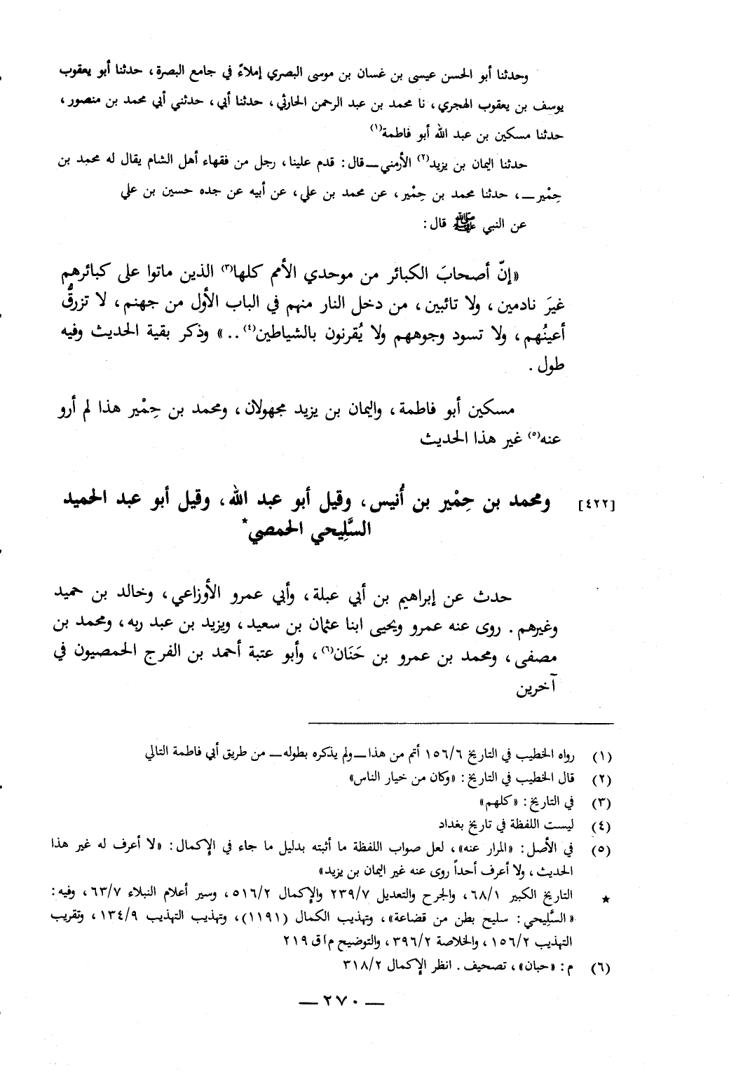 وَحَدَّثَنَا أَبُو الْحَسَنِ عِيسَى بْنُ غَسَّانَ بْنِ مُوسَى الْبَصْرِيُّ، إِمْلاءً، فِي جَامِعِ الْبَصْرَةِ، حَدَّثَنَا أَبُو يَعْقُوبَ يُوسُفُ بْنُ يَعْقُوبَ الْهَجَرِيُّ، نَا مُحَمَّدُ بْنُ عَبْدِ الرَّحْمَنِ الْحَارِثِيُّ، حَدَّثَنَا أَبِي، حَدَّثَنَا أَبِي مُحَمَّدُ بْنُ مَنْصُورٍ، حَدَّثَنَا مِسْكِينُ بْنُ عَبْدِ اللَّهِ أَبُو فَاطِمَةَ، حَدَّثَنَا الْيَمَانُ بْنُ يَزِيدَ الأَرْمَنِيُّ، قَالَ: قَدِمَ عَلَيْنَا، رَجُلٌ مِنْ فُقَهَاءِ أَهْلِ الشَّامِ يُقَالُ لَهُ: مُحَمَّدُ بْنُ حِمْيَرٍ، حَدَّثَنَا مُحَمَّدُ بْنُ حِمْيَرٍ، عَنْ مُحَمَّدِ بْنِ عَلِيٍّ، عَنْ أَبِيهِ، عَنْ جَدِّهِ حُسَيْنِ بْنِ عَلِيٍّ، عَنِ النَّبِيِّ صَلَّى اللَّهُ عَلَيْهِ وَسَلَّمَ قَالَ: «إِنَّ أَصْحَابَ الْكَبَائِرِ مِنْ مُوَحِّدِي الأُمَمِ كُلِّهَا الَّذِينَ مَاتُوا عَلَى كَبَائِرِهِمْ غَيْرَ نَادِمِينَ، وَلا تَائِبِينَ، مَنْ دَخَلَ