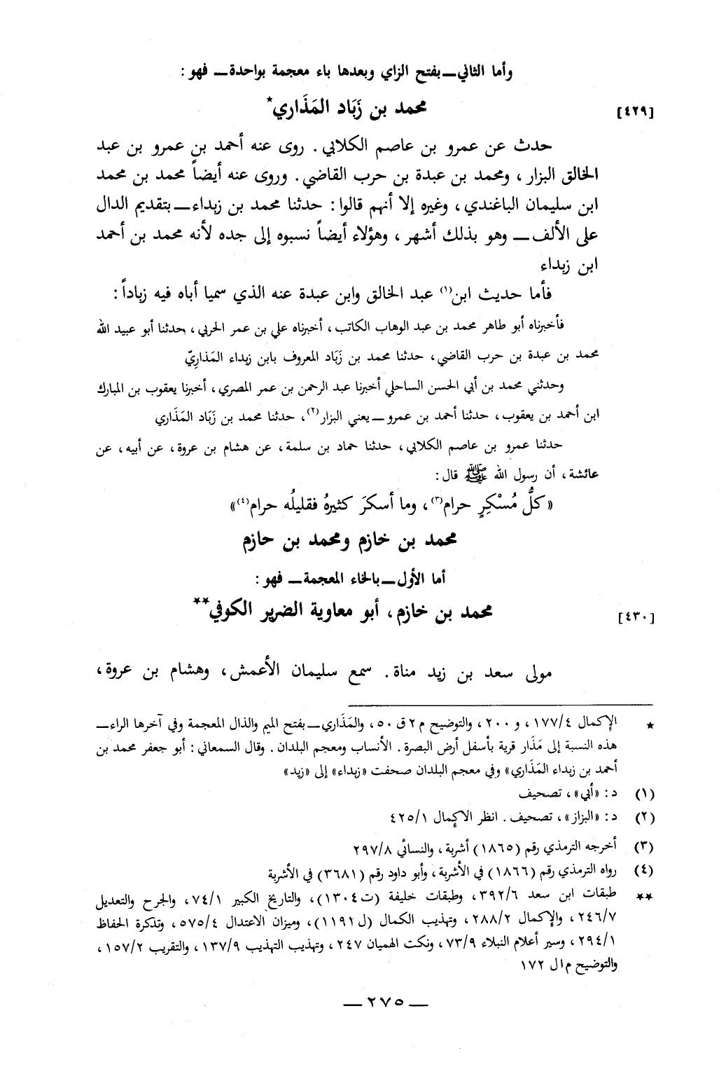 فَأَخْبَرَنَاهُ أَبُو طَاهِرٍ مُحَمَّدُ بْنُ عَبْدِ الْوَهَّابِ الْكَاتِبُ، أَخْبَرَنَاهُ عَلِيُّ بْنُ عُمَرَ الْحَرْبِيُّ، حَدَّثَنَا أَبُو عُبَيْدِ اللَّهِ مُحَمَّدُ بْنُ عَبْدَةَ بْنِ حَرْبٍ الْقَاضِي، حَدَّثَنَا مُحَمَّدُ بْنُ زَبَادٍ، الْمَعْرُوفُ بِابْنِ زَبْدَاءَ الْمَذَارِيِّ، وَحَدَّثَنَا مُحَمَّدُ بْنُ أَبِي الْحَسَنِ السَّاحِلِيُّ، أَخْبَرَنَا عَبْدُ الرَّحْمَنِ بْنُ عُمَرَ الْمِصْرِيُّ، أَخْبَرَنَا يَعْقُوبُ بْنُ الْمُبَارَكِ بْنِ أَحْمَدَ بْنِ يَعْقُوبَ، حَدَّثَنَا أَحْمَدُ بْنُ عَمْرٍو، يَعْنِي الْبَزَّارَ، حَدَّثَنَا مُحَمَّدُ بْنُ زَبَادٍ الْمَذَارِيُّ، حَدَّثَنَا عَمْرُو بْنُ عَاصِمِ الْكِلابِيُّ، حَدَّثَنَا حَمَّادُ بْنُ سَلَمَةَ، عَنْ هِشَامِ بْنِ عُرْوَةَ، عَنْ أَبِيهِ، عَنْ عَائِشَةَ، أَنّ رَسُولَ اللَّهِ صَلَّى اللَّهُ عَلَيْهِ وَسَلَّمَ قَالَ: «كُلُّ مُسْكِرٍ حَرَامٌ، وَمَا أَسْكَرَ كَثِيرُهُ فَقَلِيلُهُ حَرَامٌ»