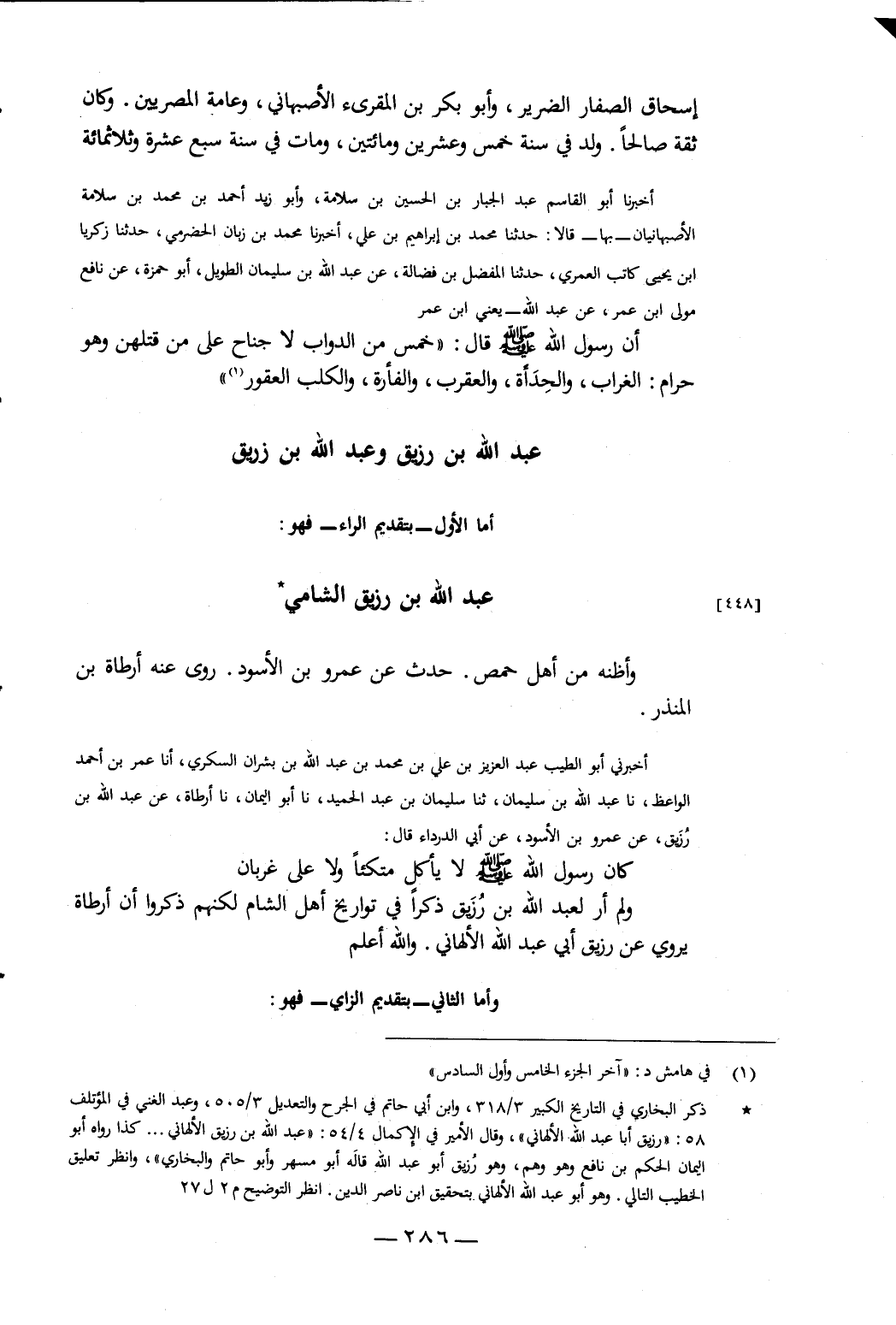 أَخْبَرَنَا أَبُو الْقَاسِمِ عَبْدُ الْجَبَّارِ بْنُ الْحُسَيْنِ بْنِ سَلامَةَ، وَأَبُو زَيْدٍ أَحْمَدُ بْنُ مُحَمَّدِ بْنِ سَلامَةَ، الَأصْبَهَانِيَانِ بِهَا قَالا: حَدَّثَنَا مُحَمَّدُ بْنُ إِبْرَاهِيمَ بْنِ عَلِيٍّ، أَخْبَرَنَا مُحَمَّدُ بْنُ زَبَّانَ الْحَضْرَمِيُّ، حَدَّثَنَا زَكَرِيَّا بْنُ يَحْيَى كَاتِبُ الْعُمَرِيِّ، حَدَّثَنَا الْمُفَضَّلُ بْنُ فَضَالَةَ، عَنْ عَبْدِ اللَّهِ بْنِ سُلَيْمَانَ الطَّوِيلِ أَبُو حَمْزَةَ، عَنْ نَافِعٍ مَوْلَى ابْنِ عُمَرَ، عَنْ عَبْدِ اللَّهِ يَعْنِي ابْنَ عُمَرَ: أَنّ رَسُولَ اللَّهِ صَلَّى اللَّهُ عَلَيْهِ وَسَلَّمَ قَالَ: " خَمْسٌ مِنَ الدَّوَابِ لا جُنَاحَ عَلَى مَنْ قَتَلَهُنَّ وَهُوَ حَرَامٌ: الْغُرَابُ، وَالْحِدَأَةُ، وَالْعَقْرَبُ، وَالْفَأْرَةُ، وَالْكَلْبُ الْعَقُورُ "