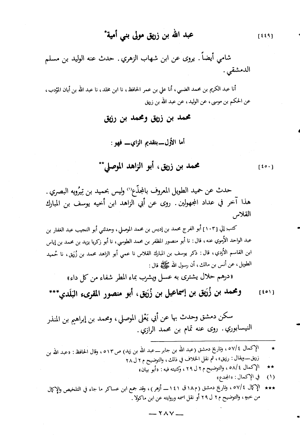كَتَبَ إِلَيَّ أَبُو الْفَرَجِ مُحَمَّدُ بْنُ إِدْرِيسَ بْنِ مُحَمَّدٍ الْمَوْصِلِيُّ، وَحَدَّثَنِي أَبُو النَّجِيبِ عَبْدُ الْغَفَّارِ بْنُ عَبْدِ الْوَاحِدِ الأَرْمَوِيُّ عَنْهُ، قَالَ: نَا أَبُو مَنْصُورٍ الْمُظَفَّرُ بْنُ مُحَمَّدٍ الطُّوسِيُّ، نَا أَبُو زَكَرِيَّا يَزِيدُ بْنُ مُحَمَّدِ بْنِ إِيَاسَ بْنِ الْقَاسِمِ الأَزْدِيُّ، قَالَ: ذَكَرَ يُوسُفُ بْنُ الْمُبَارَكِ الْقَلاسُ، نَا عَمِّي أَبُو الزَّاهِدِ مُحَمَّدُ بْنُ زُرَيْقٍ، نَا حُمَيْدٌ الطَّوِيلُ، عَنْ أَنَسِ بْنِ مَالِكٍ، أَنّ رَسُولَ اللَّهِ صَلَّى اللَّهُ عَلَيْهِ وَسَلَّمَ قَالَ: «دِرْهَمٌ حَلالٌ يُشْتَرَى بِهِ عَسَلٌ وَيُشْرَبُ بِمَاءِ الْمَطَرِ شِفَاءٌ مِنْ كُلِّ دَاءٍ»