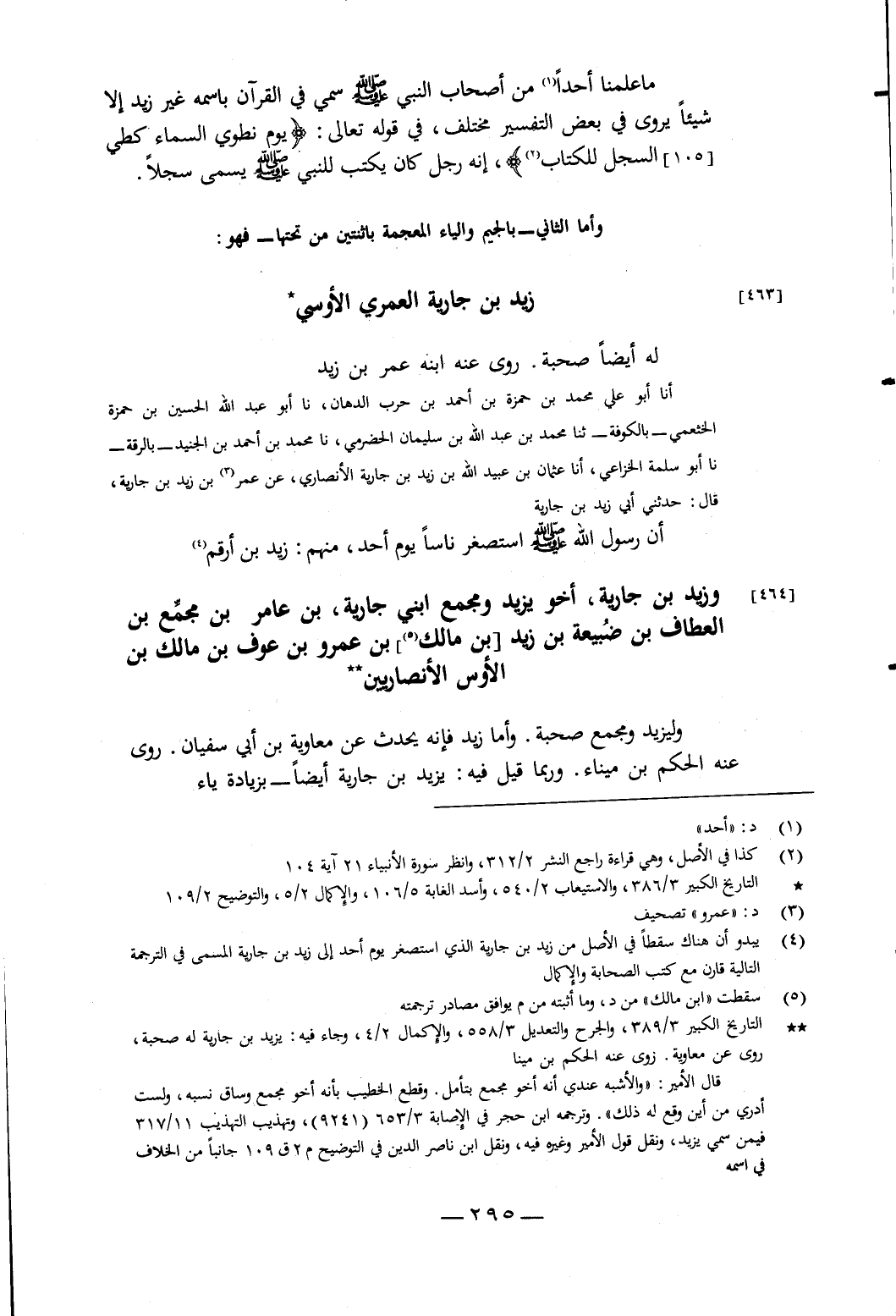" مَا عَلِمْنَا أَحَدًا مِنْ أَصْحَابِ النَّبِيِّ صَلَّى اللَّهُ عَلَيْهِ وَسَلَّمَ سُمِّيَ فِي الْقُرْآنِ بِاسْمِهِ غَيْرَ زَيْدٍ إِلا شَيْئًا يُرْوَى فِي بَعْضِ التَّفْسِيرِ مُخْتَلِفٌ، فِي قَوْلِهِ تَعَالَى: {يَوْمَ نَطْوِي السَّمَاءَ كَطَيِّ السِّجِلِّ لِلْكُتُبِ} [الأنبياء: 104]، إِنَّهُ رَجُلٌ كَانَ يَكْتُبُ لِلنَّبِيِّ صَلَّى اللَّهُ عَلَيْهِ وَسَلَّمَ يُسَمَّى سِجَلا "
