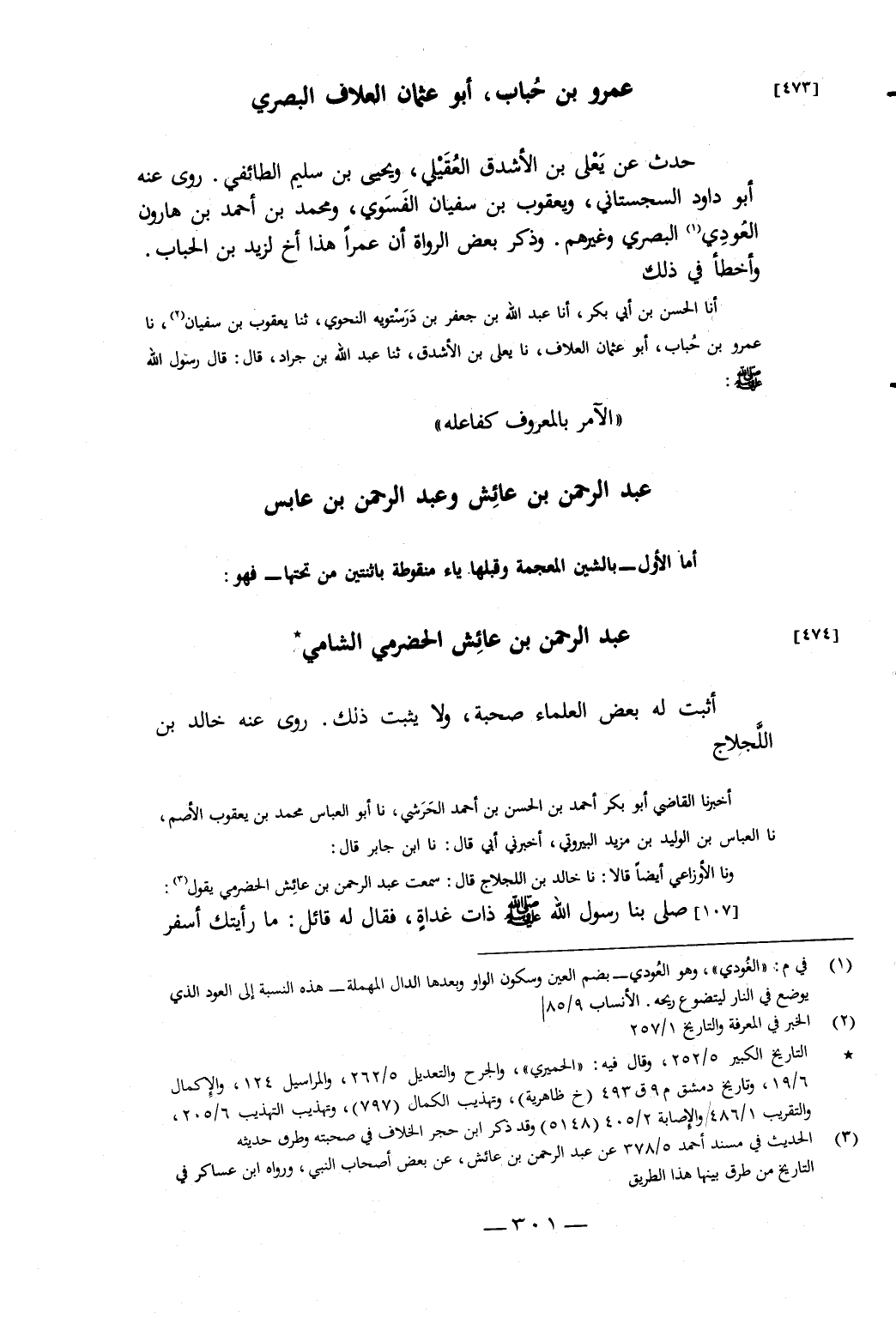 أبو عثمان العلاف البصري، حَدَّثَ عَنْ: يَعْلَى بْنِ الأَشْدَقِ الْعُقَيْلِيِّ، وَيَحْيَى بْنِ سُلَيْمٍ الطَّائِفِيِّ، رَوَى عَنْهُ: أَبُو دَاوُدَ السِّجِسْتَانِيُّ، وَيَعْقُوبُ بْنُ سُفْيَانَ الْفَسَوِيُّ، وَمُحَمَّدُ بْنُ أَحْمَدَ بْنِ هَارُونَ الْعُودِيُّ الْبَصْرِيُّ، وَغَيْرُهُمْ، وَذَكَرَ بَعْضُ الرُّوَاةِ أَنَّ عَمْرًا هَذَا أَخٌ لِزَيْدِ بْنِ الْحُبَابِ، وَأَخْطَأَ فِي ذَلِكَ