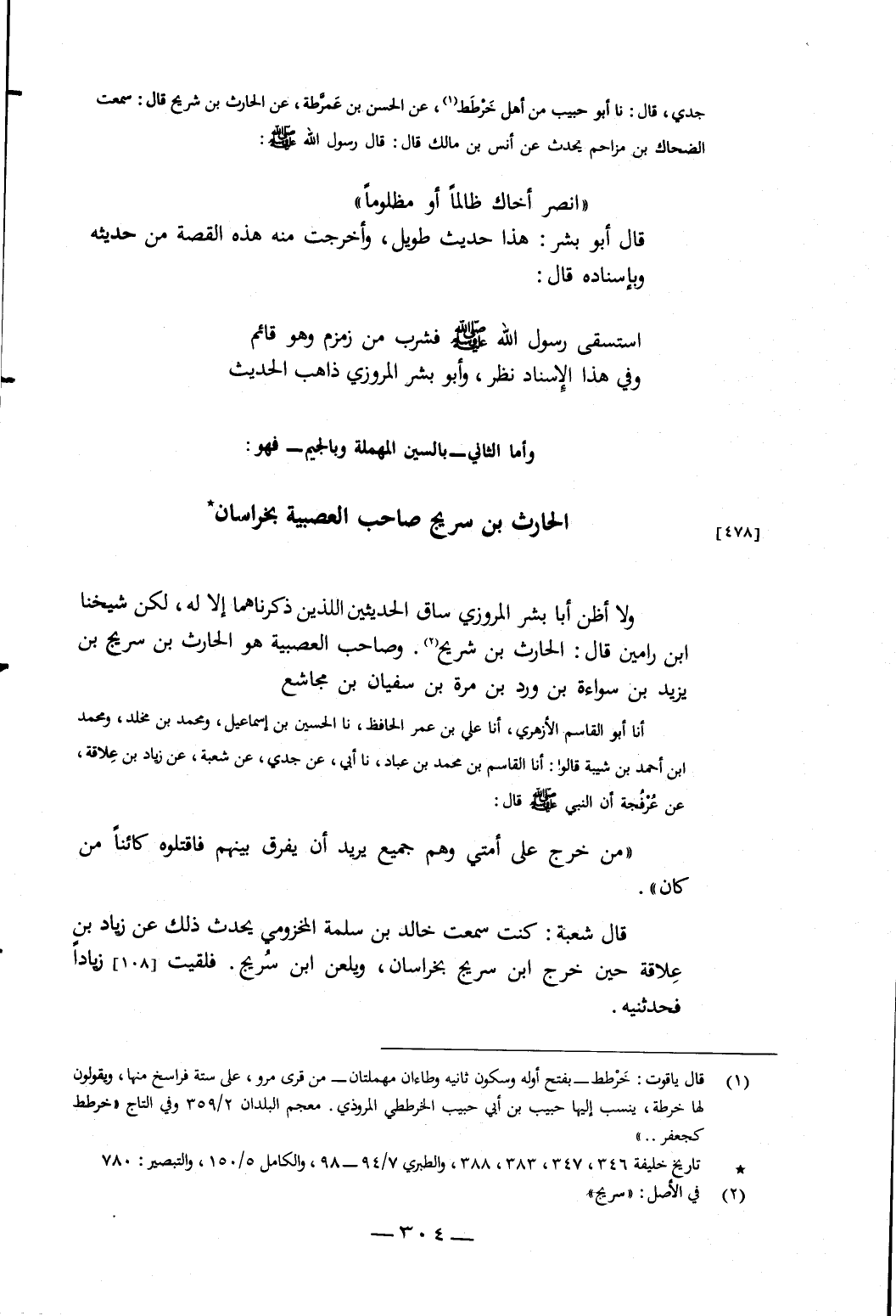 وَلا أَظُنُّ أَبَا بِشْرٍ الْمَرْوَزِيَّ سَاقَ الْحَدِيثَيْنِ اللَّذَيْنِ ذَكَرْنَاهُمَا إِلا لَهُ، لَكِنَّ شَيْخَنَا ابْنَ رَامِينَ، قَالَ: الْحَارِثُ بْنُ شُرَيْحٍ، وَصَاحِبُ الْعَصَبِيَّةِ هُوَ الْحَارِثُ بْنُ سُرَيْجِ بْنِ يَزِيدَ بْنِ سَوَاءَةَ بْنِ وَرْدِ بْنِ مُرَّةَ بْنِ سُفْيَانَ بْنِ مُجَاشِعٍ