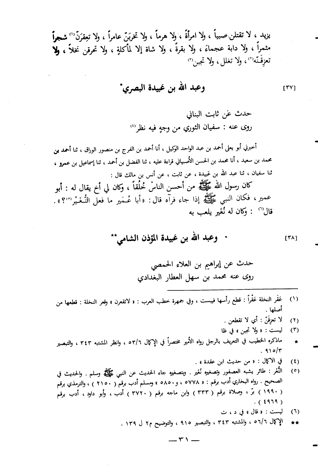 أَخْبَرَنِي أَبُو يَعْلَى أَحْمَدُ بْنُ عَبْدِ الْوَاحِدِ الْوَكِيلُ، أَنَا أَحْمَدُ بْنُ الْفَرَجِ بْنِ مَنْصُورٍ الْوَرَّاقُ، ثَنَا أَحْمَدُ بْنُ مُحَمَّدِ بْنِ سَعِيدٍ، أَنَا مُحَمَّدُ بْنُ الْحَسَنِ الأَصْبَهَانِيُّ، قَرَاءَةً عَلَيْهِ، ثَنَا الْفَضْلُ بْنُ أَحْمَدَ، ثَنَا إِسْمَاعِيلُ بْنُ عَمْرٍو، ثَنَا سُفْيَانُ، ثَنَا عَبْدُ اللَّهِ بْنُ عَبِيدَةَ، عَنْ ثَابِتٍ، عَنْ أَنَسِ بْنِ مَالِكٍ، قَالَ: " كَانَ رَسُولُ اللَّهِ صَلَّى اللَّهُ عَلَيْهِ وَسَلَّمَ مِنْ أَحْسَنِ النَّاسِ خُلُقًا، وَكَانَ لِي أَخٌ يُقَالُ لَهُ: أَبُو عُمَيْرٍ، فَكَانَ النَّبِيُّ صَلَّى اللَّهُ عَلَيْهِ وَسَلَّمَ إِذَا جَاءَ فَرَآهُ قَالَ: «أَبَا عُمَيْرٍ مَا فَعَلَ النُّغَيْرُ؟» قَالَ: وَكَانَ لَهُ نُغَيْرٌ يَلْعَبُ بِهِ