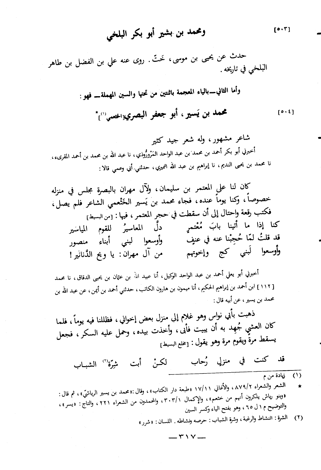 نَا عَبْدُ اللَّهِ بْنُ مُحَمَّدِ بْنِ أَحْمَدَ الْمُقْرِئُ، نَا مُحَمَّدُ بْنُ يَحْيَى النَّدِيمُ، نَا إِبْرَاهِيمُ بْنُ عَبْدِ اللَّهِ النُّمَيْرِيُّ، حَدَّثَنِي أَبِي، وَعَمِّي، قَالا: كَانَ لَنَا عَلَى الْمُعْتَمِرِ بْنِ سُلَيْمَانَ، وَلآلِ مِهْرَانَ بِالْبَصْرَةِ مَجْلِسٌ فِي مَنْزِلِهِ خُصُوصًا، وَكُنَّا يَوْمًا عِنْدَهُ، فَجَاءَ مُحَمَّدُ بْنُ يَسِيرٍ الْخَثْعَمِيُّ الشَّاعِرُ فَلَمْ يُصَلِّ، فَكَتَبَ رُقْعَةً وَاحْتَالَ إِلَى أَنْ سَقَطَتْ فِي حِجْرِ الْمُعْتَمِرِ، فِيهَا:
