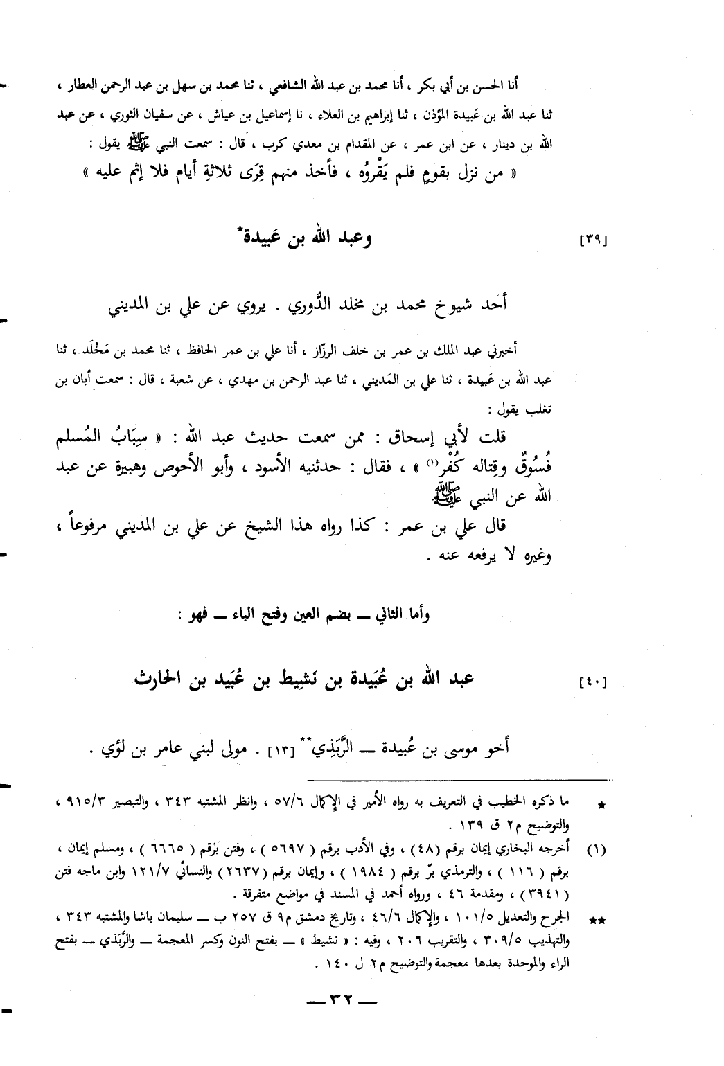 أَخْبَرَنِي عَبْدُ الْمَلِكِ بْنُ عُمَرَ بْنِ خَلَفٍ الرَّزَّازُ، أَنَا عَلِيُّ بْنُ عُمَرَ الْحَافِظُ، ثَنَا مُحَمَّدُ بْنُ مَخْلَدٍ، ثَنَا عَبْدُ اللَّهِ بْنُ عَبِيدَةَ، ثَنَا عَلِيُّ بْنُ الْمَدِينِيِّ، ثَنَا عَبْدُ الرَّحْمَنِ بْنُ مَهْدِيٍّ، عَنْ شُعْبَةَ، قَالَ: سَمِعْتُ أَبَانَ بْنَ تَغْلِبَ، يَقُولُ: قُلْتُ لأَبِي إِسْحَاقَ: مِمَّنْ سَمِعْتَ حَدِيثَ عَبْدِ اللَّهِ:: «سِبَابُ الْمُسْلِمِ فُسُوقٌ وَقِتَالُهُ كُفْرٌ»، فَقَالَ: حَدَّثَنِيهِ الأَسْوَدُ، وَأَبُو الأَحْوَصِ، وَهُبَيْرَةُ عَنْ عَبْدِ اللَّهِ، عَنِ النَّبِيِّ صَلَّى اللَّهُ عَلَيْهِ وَسَلَّمَ، قَالَ عَلِيُّ بْنُ عُمَرَ: كَذَا رَوَاهُ هَذَا الشَّيْخُ عَنْ عَلِيِّ بْنِ الْمَدِينِيِّ مَرْفُوعًا، وَغَيْرُهُ لا يَرْفَعُهُ عَنْهُ