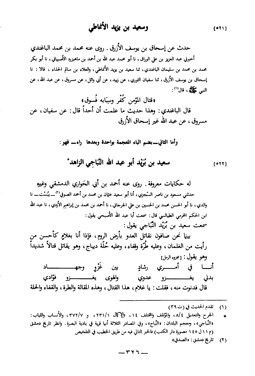 حَدَّثَنِي مَسْعُودُ بْنُ نَاصِرٍ السِّجْزِيُّ، أَنَا أَبُو سَعِيدٍ عُثْمَانُ بْنُ مُحَمَّدِ بْنِ أَحْمَدَ الصُّوفِيُّ، بِبنُسْتَ، نَا وَالِدِي، نَا أَبُو الْحَسَنِ مُحَمَّدُ بْنُ الْحُسَيْنِ بْنِ عَلِيٍّ الْجُرْجَانِيُّ، نَا أَحْمَدُ بْنُ مُحَمَّدِ بْنِ إِبْرَاهِيمَ الأَزْدِيُّ، نَا عَبْدُ اللَّهِ بْنُ الْحَكَمِ الْمَخْرَمِيُّ الطَّيَالِسِيُّ، قَالَ: سَمِعْتُ أَبَا عَبْدِ اللَّهِ الأَصْبَحِيَّ، يَقُولُ: سَمِعْتُ سَعِيدَ بْنَ بُرَيْدٍ النِّبَاجِيَّ، يَقُولُ: " بَيْنَمَا نَحْنُ صَافُّونَ نُقَاتِلُ الْعَدُوَّ بِأَرْضِ الرُّومِ، فَإِذَا أَنَا بِغُلامٍ كَأَحْسَنِ مَنْ رَأَيْتَ مِنَ الْغِلْمَانِ، وَعَلَيْهِ طُرَّةٌ وَقُفَاءُ، وَعَلَيْهِ حُلَّةٌ دِيبَاجٍ، وَهُوَ يُقَاتِلُ قِتَالا شَدِيدًا، وَهُوَ يَقُولُ: