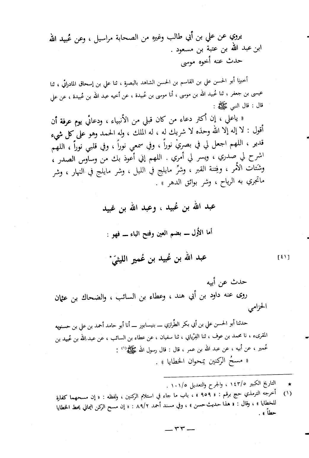 حَدَّثَنَا أَبُو الْحَسَنِ عَلِيُّ بْنُ أَبِي بَكْرٍ الطِّرَازِيُّ، بِنَيْسَابُورَ، أَنَا أَبُو حَامِدٍ أَحْمَدُ بْنُ عَلِيِّ بْنِ حَسْنَوَيْهِ الْمُقْرِئُ، نَا مُحَمَّدُ بْنُ عَوْفٍ، ثَنَا الْفِرْيَابِيُّ، ثَنَا سُفْيَانُ، عَنْ عَطَاءِ بْنِ السَّائِبِ، عَنْ عَبْدِ اللَّهِ بْنِ عُبَيْدِ بْنِ عُمَيْرٍ، عَنْ أَبِيهِ، عَنْ عَبْدِ اللَّهِ بْنِ عُمَرَ، قَالَ: قَالَ رَسُولُ اللَّهِ صَلَّى اللَّهُ عَلَيْهِ وَسَلَّمَ: «مَسْحُ الرُّكْنَيْنِ يَمْحُوَانِ الْخَطَايَا»