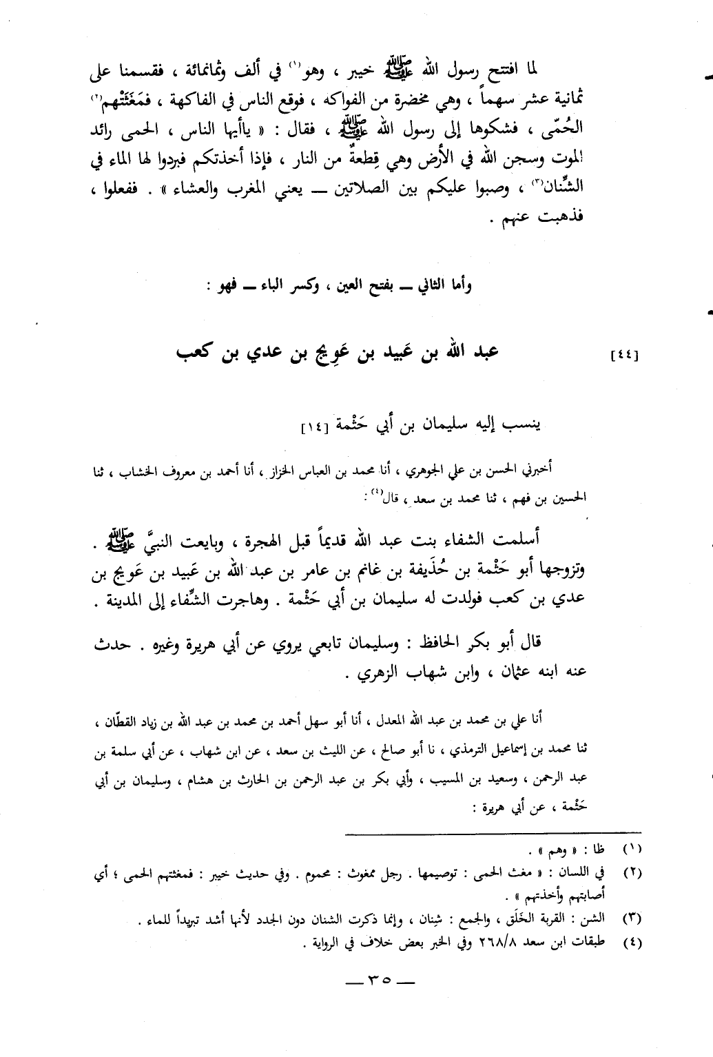 أَنَا أَحْمَدُ بْنُ مَعْرُوفٍ الْخَشَّابُ، ثَنَا الْحُسَيْنُ بْنُ فَهْمٍ، ثَنَا مُحَمَّدُ بْنُ سَعْدٍ، قَالَ: أَسْلَمَتِ الشِّفَاءُ بِنْتُ عَبْدِ اللَّهِ قَدِيمًا قَبْلَ الْهِجْرَةِ، وَبَايَعَتِ النَّبِيَّ صَلَّى اللَّهُ عَلَيْهِ وَسَلَّمَ، وَتَزَوَّجَهَا أَبُو حَثْمَةَ بْنُ حُذَيْفَةَ بْنِ غَانِمِ بْنِ عَامِرِ بْنِ عَبْدِ اللَّهِ بْنِ عَبِيدِ بْنِ عَوِيجِ بْنِ عَدِيِّ بْنِ كَعْبٍ، فَوَلَدَتْ لَهُ سُلَيْمَانَ بْنَ أَبِي حَثْمَةَ، وَهَاجَرَتِ الشِّفَاءُ إِلَى الْمَدِينَةِ قَالَ أَبُو بَكْرٍ الْحَافِظُ: وَسُلَيْمَانُ تَابِعِيٌّ يَرْوِي عَنْ: أَبِي هُرَيْرَةَ، وَغَيْرُهُ، حَدَّثَ عَنْهُ: ابْنُهُ عُثْمَانُ، وَابْنُ شِهَابٍ الزُّهْرِيُّ