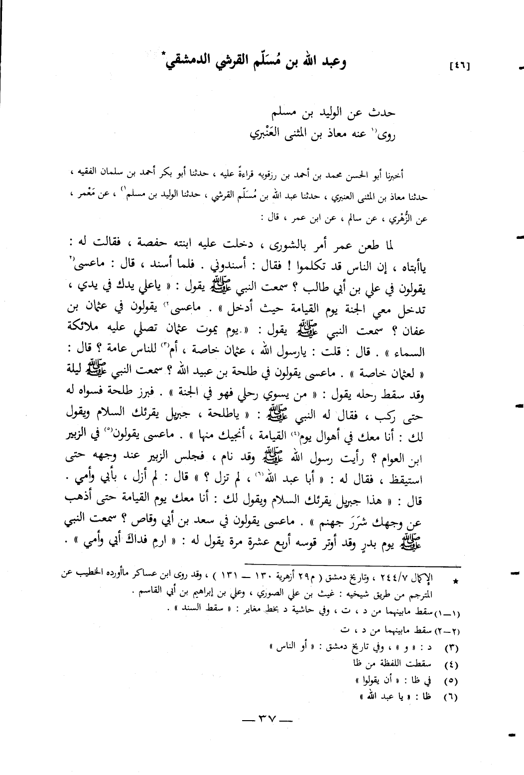 أَخْبَرَنَا أَبُو الْحَسَنِ مُحَمَّدُ بْنُ أَحْمَدَ بْنِ رِزْقَوَيْهِ، قِرَاءَةً عَلَيْهِ، حَدَّثَنَا أَبُو بَكْرٍ أَحْمَدُ بْنُ سَلْمَانَ الْفَقيِهُ، حَدَّثَنَا مُعَاذُ بْنُ الْمُثَنَّى الْعَنْبَرِيُّ، حَدَّثَنَا عَبْدُ اللَّهِ بْنُ مُسَلَّمٍ الْقُرَشِيُّ، حَدَّثَنَا الْوَلِيدُ بْنُ مُسْلِمٍ، عَنْ مَعْمَرٍ، عَنِ الزُّهْرِيِّ، عَنْ سَالِمٍ، عَنِ ابْنِ عُمَرَ، قَالَ: لَمَّا طُعِنَ عُمَرُ أَمَرَ بِالشُّورَى، دَخَلَتْ عَلَيْهِ ابْنَتُهُ حَفْصَةُ، فَقَالَتْ لَهُ: يَا أَبَتَاهُ، إِنَّ النَّاسَ قَدْ تَكَلَّمُوا! فَقَالَ: أَسْنِدُونِي، فَلَمَّا أُسْنِدَ، قَالَ: مَا عَسَى يَقُولُونَ فِي عَلِيِّ بْنِ أَبِي طَالِبٍ؟ سَمِعْتُ النَّبِيَّ صَلَّى اللَّهُ عَلَيْهِ وَسَلَّمَ يَقُولُ: «يَا عَلِيُّ، يَدُكَ فِي يَدِي، تَدْخُلْ مَعِي الْجَنَّةَ يَوْمَ الْقِيَامَةِ حَيْثُ أَدْخُلُ»