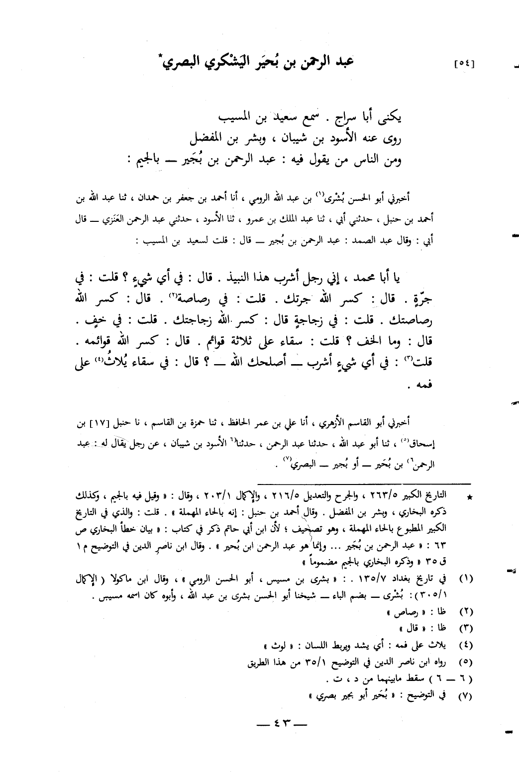 أَخْبَرَنِي أَبُو الْقَاسِمِ الأَزْهَرِيُّ، أَنَا عَلِيُّ بْنُ عُمَرَ الْحَافِظُ، ثَنَا حَمْزَةُ بْنُ الْقَاسِمِ، نَا حَنْبَلُ بْنُ إِسْحَاقَ، ثَنَا أَبُو عَبْدِ اللَّهِ، حَدَّثَنَا عَبْدُ الرَّحْمَنِ، حَدَّثَنَا الأَسْوَدُ بْنُ شَيْبَانَ، عَنْ رَجُلٍ يُقَالُ لَهُ: عَبْدُ الرَّحْمَنِ بْنُ بُحَيْرٍ، أَوْ بُجَيْرٍ - الْبَصْرِيُّ،