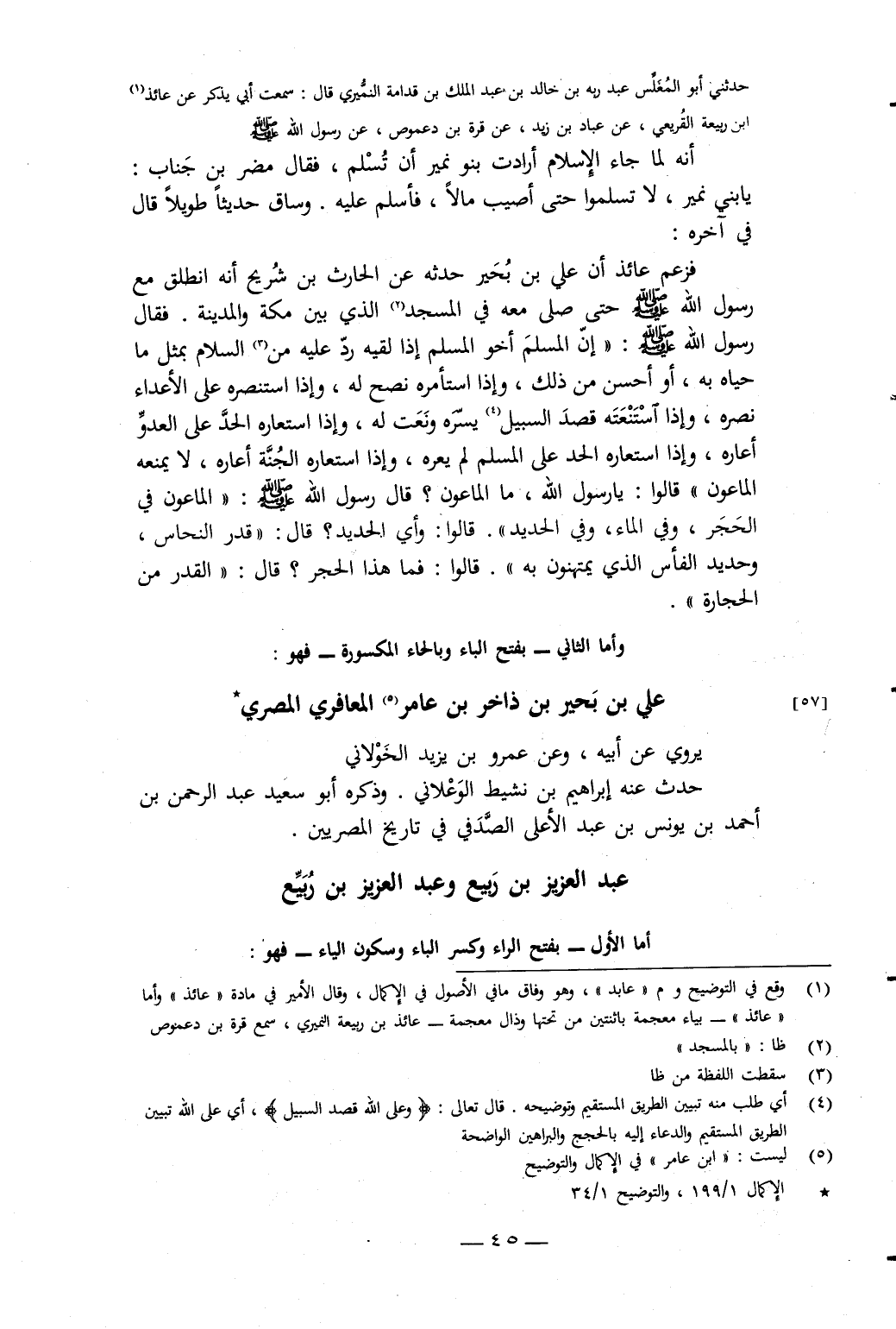 حَدَّثَنِي أَبُو الْمُغَلِّسِ عَبْدُ رَبِّهِ بْنُ خَالِدِ بْنِ عَبْدِ الْمَلَكِ بْنِ قُدَامَةَ النُّمَيْرِيُّ، قَالَ: سَمِعْتُ أَبِي يَذْكُرُ، عَنْ عَائِذِ بْنِ رَبِيعَةَ الْقُرَيْعِيِّ، عَنْ عَبَّادِ بْنِ زَيْدٍ، عَنْ قُرَّةَ بْنِ دَعْمُوصٍ، عَنْ رَسُولِ اللَّهِ صَلَّى اللَّهُ عَلَيْهِ وَسَلَّمَ: أَنَّهُ لَمَّا جَاءَ الإِسْلامُ أَرَادَتْ بَنُو نُمَيْرٍ أَنْ تُسْلِمَ، فَقَالَ مُضَرُ بْنُ جَنَابٍ: يَا بَنِي نُمَيْرٍ، لا تُسْلِمُوا حَتَّى أُصِيبَ مَالا، فَأَسْلَمَ عَلَيْهِ، وَسَاقَ حَدِيثًا طَوِيلا قَالَ فِي آخِرِهِ: فَزَعَمَ عَائِذٌ أَنَّ عَلِيَّ بْنَ بُحَيْرٍ حَدَّثَهُ، عَنِ الْحَارِثِ بْنِ شُرَيْحٍ أَنَّهُ انْطَلَقَ مَعَ رَسُولِ اللَّهِ صَلَّى اللَّهُ عَلَيْهِ وَسَلَّمَ حَتَّى صَلَّى مَعَهُ فِي الْمَسْجِدِ الَّذِي بَيْنَ مَكَّةَ وَالْمَدِينَةِ، فَقَالَ رَسُولُ اللَّهِ صَلَّى اللَّهُ عَلَيْهِ وَسَلَّمَ: «إِنَّ الْمُسْلِمَ أَخُو الْمُسْلِمِ إِذَا لَقِيَهُ رَدَّ عَلَيْهِ مِنَ السَّلامِ بِمِثْلِ مَا حَيَّاهُ بِهِ، أَوْ أَحْسَنُ مِنْ ذَلِكَ، وَإِذَا اسْتَأْمَرَهُ نَصَحَ لَهُ، وَإِذَا اسْتَنْصَرَهُ عَلَى الأَعْدَاءِ نَصَرَهُ، وَإِذَا اسْتَنْعَتَهُ قَصْدَ السَّبِيلِ يَسَّرَهُ وَنَعَتَ لَهُ، وَإِذَا اسْتَعَارَهُ الْحَدَّ عَلَى الْعَدُوِّ أَعَارَهُ وَإِذَا اسْتَعَارَهُ الْحَدَّ عَلَى الْمُسْلِمِ لَمْ يُعِرْهُ , وَإِذَا اسْتَعَارَهُ الْجُنَّةَ أَعَارَهُ , لا يَمْنَعُهُ الْمَاعُونَ» قَالُوا: يَا رَسُولَ اللَّهِ، مَا الْمَاعُونُ؟ قَالَ رَسُولُ اللَّهِ صَلَّى اللَّهُ عَلَيْهِ وَسَلَّمَ: «الْمَاعُونُ فِي الْحَجَرِ، وَفِي الْمَاءِ، وَفِي