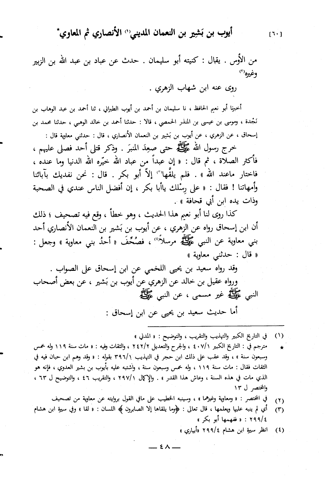 أَخْبَرَنَا أَبُو نُعَيْمٍ الْحَافِظُ، نَا سُلَيْمَانُ بْنُ أَحْمَدَ بْنِ أَيُّوبَ الطَّبَرَانِيُّ، ثَنَا أَحْمَدُ بْنُ عَبْدِ الْوَهَّابِ بْنِ نَجْدَةَ، وَمُوسَى بْنُ عِيسَى بْنِ الْمُنْذِرِ الْحِمْصِيُّ، قَالا: حَدَّثَنَا أَحْمَدُ بْنُ خَالِدٍ الْوَهْبِيُّ، حَدَّثَنَا مُحَمَّدُ بْنُ إِسْحَاقَ، عَنِ الزُّهْرِيِّ، عَنْ أَيُّوبَ بْنِ بَشِيرِ بْنِ النُّعْمَانِ الأَنْصَارِيِّ، قَالَ: حَدَّثَنِي مُعَاوِيَةُ، قَالَ: خَرَجَ رَسُولُ اللَّهِ صَلَّى اللَّهُ عَلَيْهِ وَسَلَّمَ حَتَّى صَعِدَ الْمِنْبَرَ، وَذَكَرَ قَتْلَى أُحُدٍ فَصَلَّى عَلَيْهِمْ، فَأَكْثَرَ الصَّلاةَ، ثُمَّ قَالَ: «إِنَّ عَبْدًا مِنْ عِبَادِ اللَّهِ خَيَّرَهُ اللَّهُ الدُّنْيَا وَمَا عِنْدَهُ، فَاخْتَارَ مَا عِنْدَ اللَّهِ»، فَلَمْ يُلَقَّهَا إِلا أَبُو بَكْرٍ، قَالَ: نَحْنُ نَفْدِيكَ بِآبَائِنَا وَأُمَّهَاتِنَا، فَقَالَ: «عَلَى رِسْلِكَ يَا أَبَا بَكْرٍ، إِنَّ أَفْضَلَ النَّاسِ عِنْدِي فِي الصُّحْبَةِ وَذَاتِ يَدِهِ ابْنُ أَبِي قُحَافَةَ»، كَذَا رَوَى لَنَا أَبُو نُعَيْمٍ هَذَا الْحَدِيثَ، وَهُوَ خَطَأٌ وَقَعَ فِيهِ تَصْحِيفٌ ذَلِكَ، أَنَّ ابْنَ إِسْحَاقَ رَوَاهُ، عَنِ الزُّهْرِيِّ، عَنْ أَيُّوبَ بْنِ بَشِيرِ بْنِ النُّعْمَانِ الأَنْصَارِيِّ، أَحَدِ بَنِي مُعَاوِيَةَ، عَنِ النَّبِيِّ صَلَّى اللَّهُ عَلَيْهِ وَسَلَّمَ مُرْسَلا، فَصُحِّفَ أَحَدُ بَنِي مُعَاوِيَةَ وَجُعِلَ، قَالَ: حَدَّثَنِي مُعَاوِيَةُ وَقَدْ رَوَاهُ سَعِيدُ بْنُ يَحْيَى اللَّخْمِيُّ، عَنِ ابْنِ إِسْحَاقَ عَلَى الصَّوَابِ، وَرَوَاهُ عُقَيْلُ بْنُ خَالِدٍ، عَنِ الزُّهْرِيِّ، عَنْ أَيُّوبَ بْنِ بَشِيرٍ، عَنْ بَعْضِ أَصْحَابِ النَّبِيِّ صَلَّى اللَّهُ عَلَيْهِ وَسَلَّمَ غَيْرُ مُسَمًّى، عَنِ النَّبِيِّ صَلَّى اللَّهُ عَلَيْهِ وَسَلَّمَ أَمَّا
