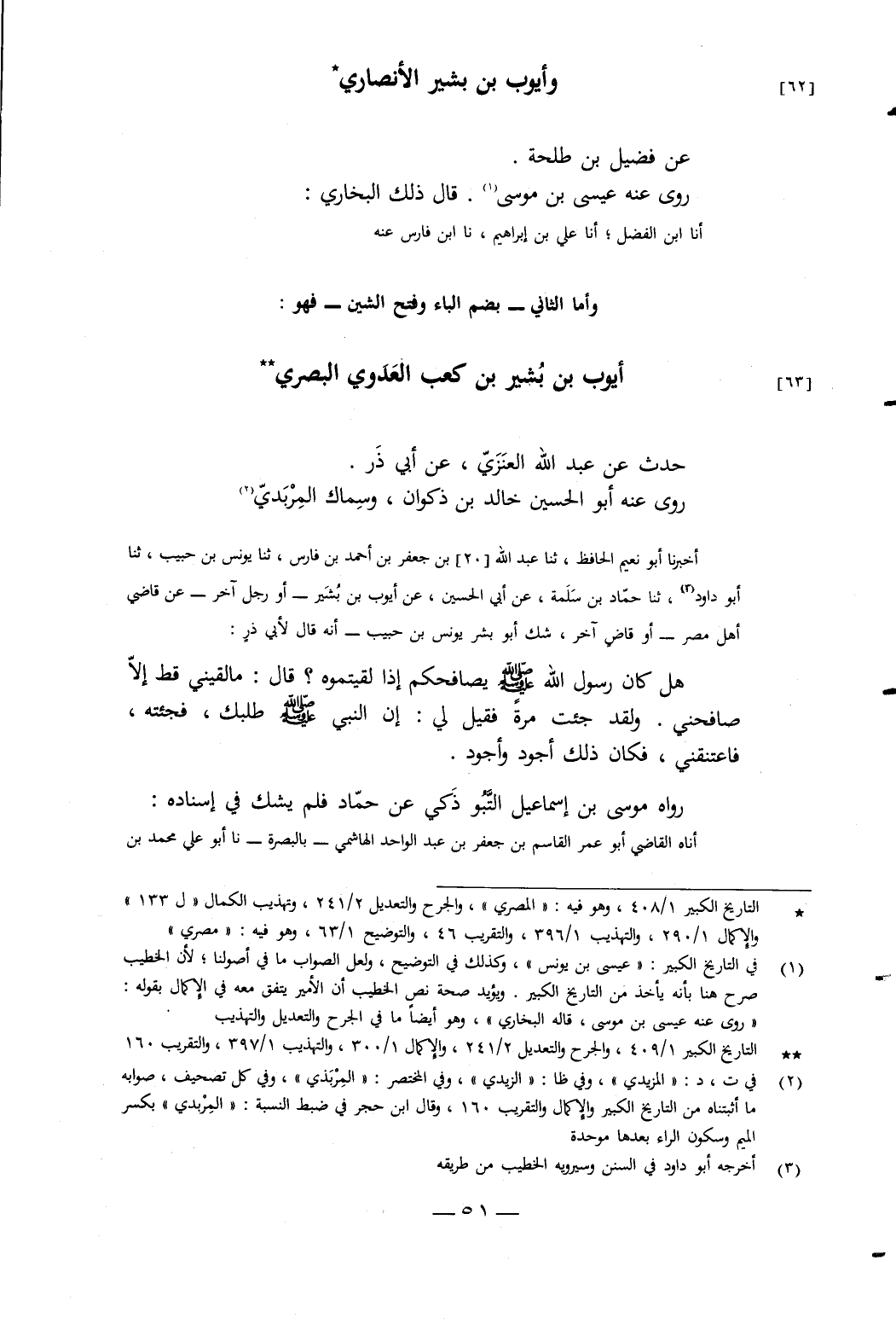 أَخْبَرَنَا أَبُو نُعَيْمٍ الْحَافِظُ، ثَنَا عَبْدُ اللَّهِ بْنُ جَعْفَرِ بْنِ أَحْمَدَ بْنِ فَارِسٍ، ثَنَا يُونُسُ بْنُ حَبِيبٍ، ثَنَا أَبُو دَاوُدَ، ثَنَا حَمَّادُ بْنُ سَلَمَةَ، عَنْ أَبِي الْحُسَيْنِ، عَنْ أَيُّوبَ بْنِ بُشَيْرٍ، أَوْ رَجُلٍ آخَرَ، عَنْ قَاضِي أَهْلِ مِصْرَ، أَوْ قَاضٍ آخَرَ، شَكَّ أَبُو بِشْرٍ يُونُسُ بْنُ حَبِيبٍ، أَنَّهُ قَالَ لأَبِي ذَرٍّ: هَلْ كَانَ رَسُولُ اللَّهِ صَلَّى اللَّهُ عَلَيْهِ وَسَلَّمَ يُصَافِحُكُمْ إِذَا لَقِيتُمُوهُ؟ قَالَ: " مَا لَقِيَنِي قَطُّ إِلا صَافَحَنِي، وَلَقَدْ جِئْتُ مَرَّةً فَقِيلَ لِي: إِنَّ النَّبِيَّ صَلَّى اللَّهُ عَلَيْهِ وَسَلَّمَ طَلَبَكَ، فَجِئْتُهُ، فَاعْتَنَقَنِي، فَكَانَ ذَلِكَ أَجْوَدَ وَأَجْوَدَ "، رَوَاهُ مُوسَى بْنُ إِسْمَاعِيلَ التَّبُوذَكِيُّ، عَنْ حَمَّادٍ فَلَمْ يَشُكَّ فِي إِسْنَادِهِ