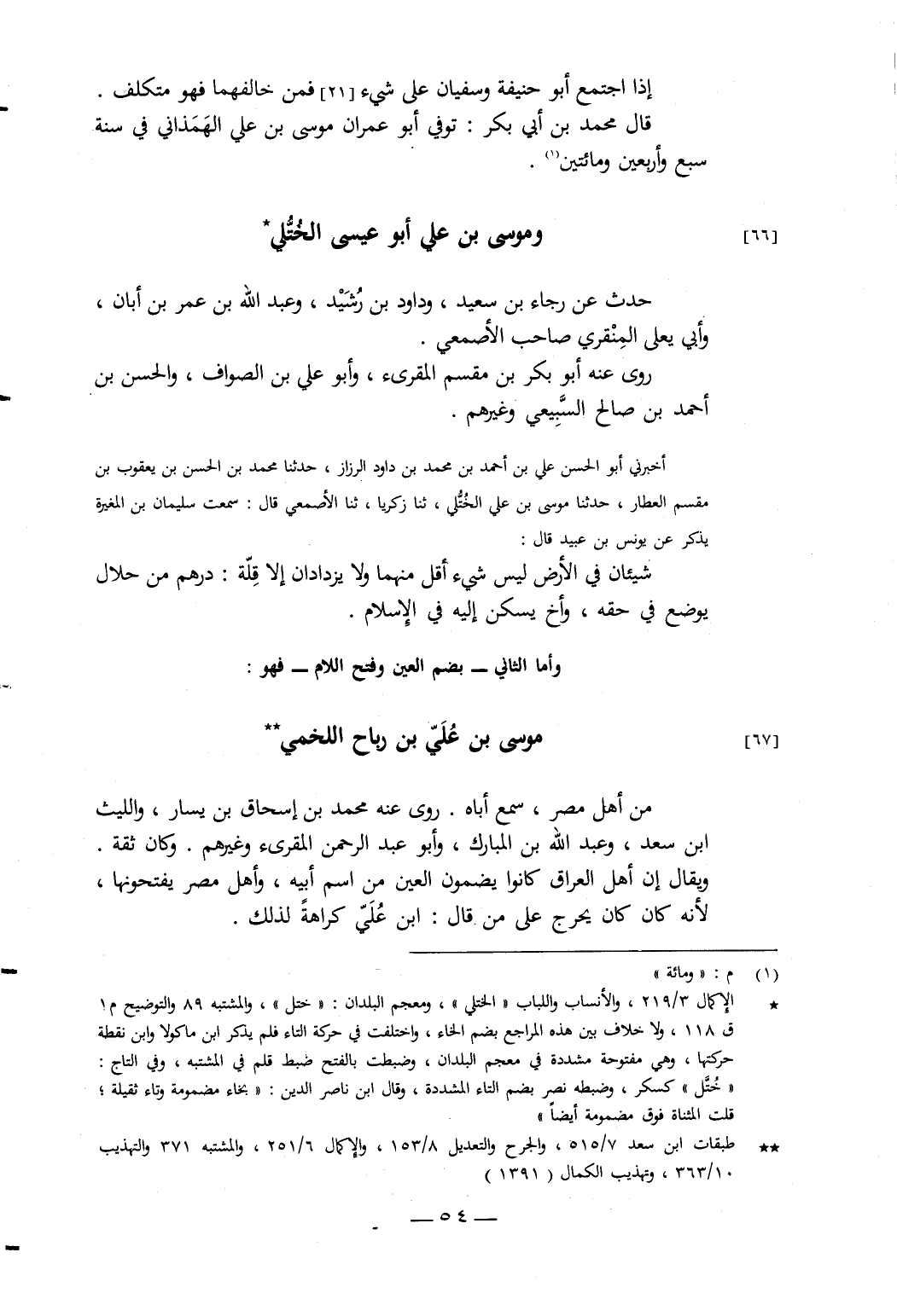 قَالَ: إِذَا اجْتَمَعَ أَبُو حَنِيفَةَ وَسُفْيَانُ عَلَى شَيْءٍ فَمَنْ خَالَفَهُمَا فَهُوَ مُتَكَلِّفٌ، قَالَ مُحَمَّدُ بْنُ أَبِي بَكْرٍ: تُوُفِّيَ أَبُو عِمْرَانَ مُوسَى بْنُ عَلِيٍّ الْهَمَذَانِيُّ فِي سَنَةِ سَبْعٍ وَأَرْبَعِينَ وَمِائَتَيْنِ