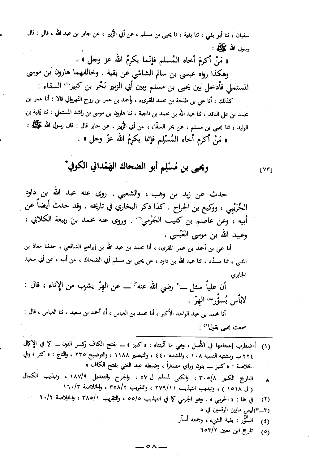 سُفْيَانَ، ثَنَا أَبُو بَقِيٍّ، ثَنَا بَقِيَّةُ، نَا يَحْيَى بْنُ مُسْلِمٍ، عَنْ أَبِي الزُّبَيْرِ، عَنْ جَابِرِ بْنِ عَبْدِ اللَّهِ، قَالَ: قَالَ رَسُولُ اللَّهِ صَلَّى اللَّهُ عَلَيْهِ وَسَلَّمَ: «مَنْ أَكْرَمَ أَخَاهُ الْمُسْلِمَ فَإِنَّمَا يُكْرِمُ اللَّهَ عَزَّ وَجَلَّ»، وَهَكَذَا رَوَاه ُعِيسَى بْنُ سَالِمٍ الشَّاشِيُّ، عَنْ بَقِيَّةَ، وَخَالَفَهُمَا هَارُونُ بْنُ مُوسَى الْمُسْتَمْلِي، فَأَدْخَلَ بَيْنَ يَحْيَى بْنِ مُسْلِمٍ وَبَيْنَ أَبِي الزُّبَيْرِ بَحْرِ بْنِ كُنَيْزٍ السَّقَّاءِ