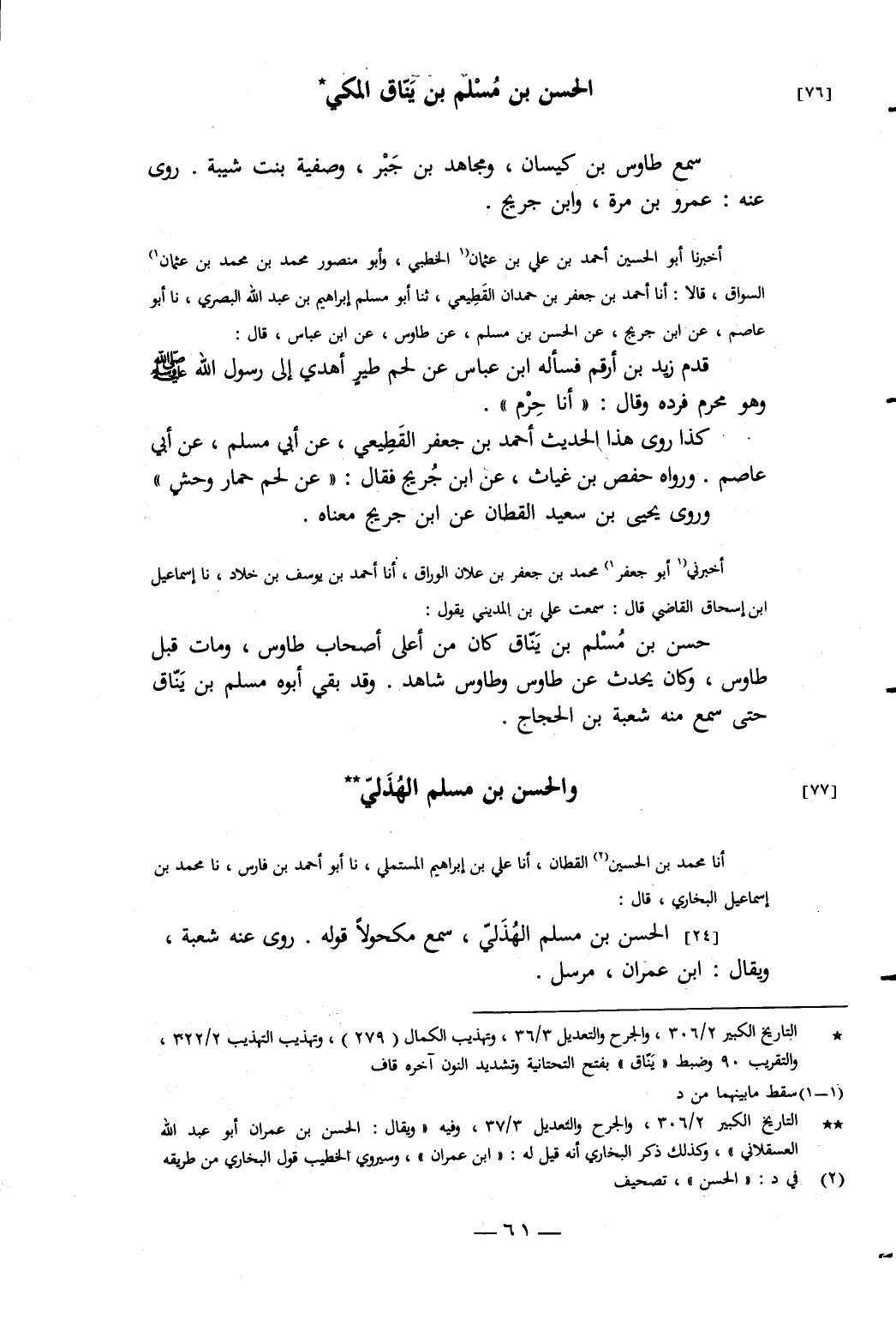 أَنَا مُحَمَّدُ بْنُ الْحُسَيْنِ الْقَطَّانُ، أَنَا عَلِيُّ بْنُ إِبْرَاهِيمَ الْمُسْتَمْلِيُّ، نَا أَبُو أَحْمَدَ بْنِ فَارِسٍ، نَا مُحَمَّدُ بْنُ إِسْمَاعِيلَ الْبُخَارِيُّ، قَالَ: الْحَسَنُ بْنُ مُسْلِمٍ الْهُذَلِيُّ، سَمِعَ مَكْحُولا قَوْلَهُ، رَوَى عَنْهُ شُعْبَةُ وَيُقَالُ: ابْنُ عِمْرَانَ، مُرْسَلٌ