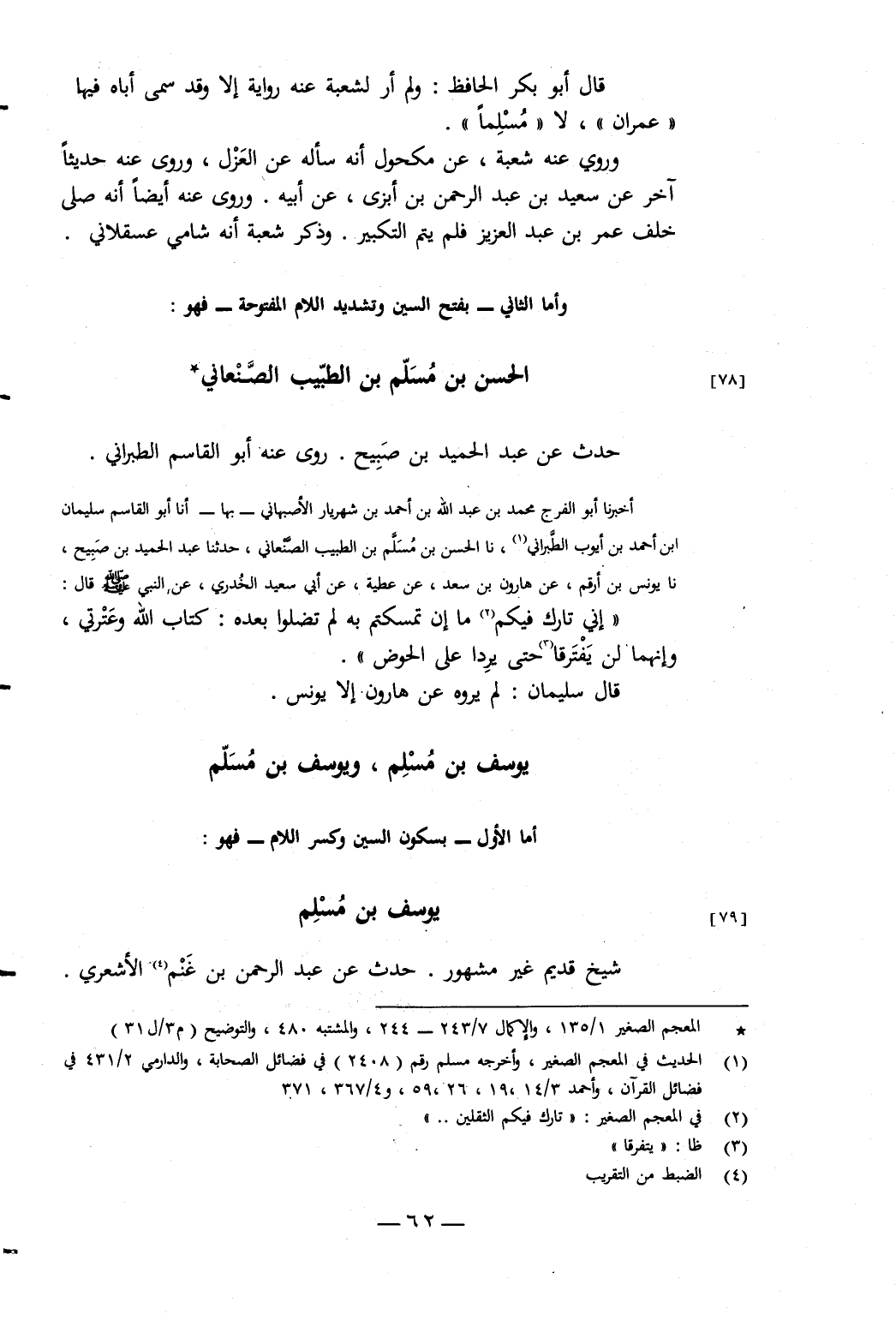 قَالَ أَبُو بَكْرٍ الْحَافِظُ: وَلَمْ أَرَ لِشُعْبَةَ عَنْهُ رِوَايَةً إِلا وَقَدْ سَمَّى أَبَاهُ فِيهَا عِمْرَانَ، لا مُسْلِمًا وَرَوَى عَنْهُ شُعْبَةُ، عَنْ مَكْحُولٍ أَنَّهُ سَأَلَهُ عَنِ الْعَزْلِ، وَرَوَى عَنْهُ حَدِيثًا آخَرَ عَنْ سَعِيدِ بْنِ عَبْدِ الرَّحْمَنِ بْنِ أُبْزَى، عَنْ أَبِيهِ، وَرَوَى عَنْهُ أَيْضًا أَنَّهُ صَلَّى خَلْفَ عُمَرَ بْنِ عَبْدِ الْعَزِيزِ فَلَمْ يُتِمَّ التَّكْبِيرَ، وَذَكَرَ شُعْبَةُ أَنَّهُ شَامِيٌّ عَسْقَلانِيٌّ وَأَمَّا الثَّانِي بِفَتْحِ السِّينِ وَتَشْدِيدِ اللامِ الْمَفْتُوحَةِ فَهُوَ: