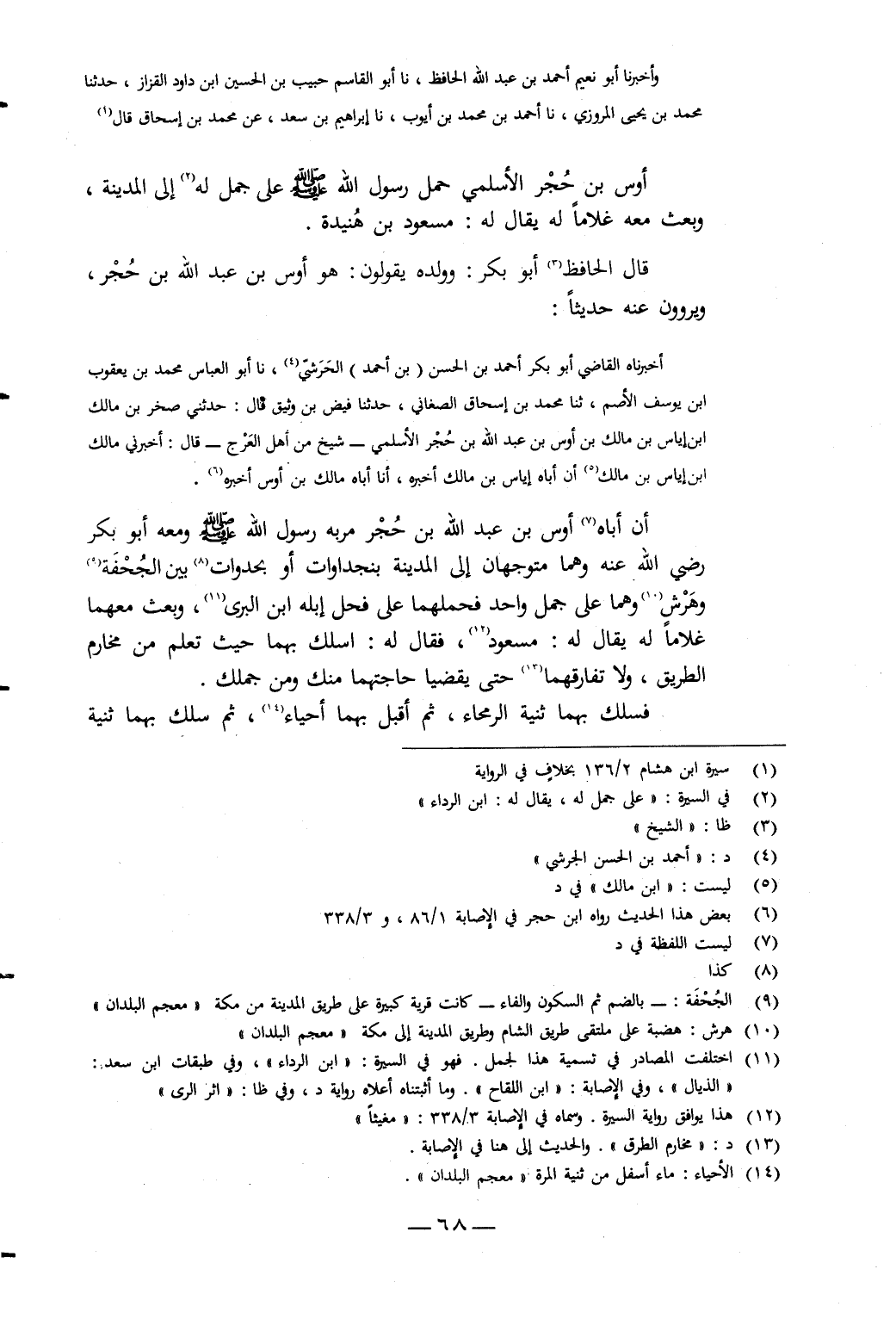 أَخْبَرَنَاهُ الْقَاضِي أَبُو بَكْرٍ أَحْمَدُ بْنُ الْحَسَنِ بْنِ أَحْمَدَ الْحَرَشِيُّ، نَا أَبُو الْعَبَّاسِ مُحَمَّدُ بْنُ يَعْقُوبَ بْنِ يُوسُفَ الأَصَمُّ، ثَنَا مُحَمَّدُ بْنُ إِسْحَاقَ الصَّغَانِيُّ، حَدَّثَنَا فَيْضُ بْنُ وَثِيقٍ، قَالَ: حَدَّثَنِي صَخْرُ بْنُ مَالِكِ بْنِ إِيَاسِ بْنِ مَالِكِ بْنِ أَوْسِ بْنِ عَبْدِ اللَّهِ بْنِ حُجْرٍ الأَسْلَمِيُّ، شَيْخٌ مِنْ أَهْلِ الْعَرْجِ، قَالَ: أَخْبَرَنِي مَالِكُ بْنُ إِيَاسِ بْنِ مَالِكٍ، أَنَّ أَبَاهُ إِيَاسَ بْنَ مَالِكٍ، أَخْبَرَهُ، أَنَا أَبَاهُ مَالِكَ بْنَ أَوْسٍ، أَخْبَرَهُ: أَنَّ أَبَاهُ أَوْسَ بْنَ عَبْدِ اللَّهِ بْنِ حُجْرٍ، مَرَّ بهِ رَسُولُ اللَّهِ صَلَّى اللَّهُ عَلَيْهِ وَسَلَّمَ وَمَعَهُ أَبُو بَكْرٍ رَضِيَ اللَّهُ عَنْهُ وَهُمَا مُتَوَجِّهَانِ إِلَى الْمَدِينَةِ بِنَجْدَاوَاتٍ أَوْ بَحَدْوَاتٍ بَيْنَ الْجُحْفَةِ وَهَرْشٍ وَهُمَا عَلَى جَمَلٍ وَاحِدٍ فَحَمَلَهُمَا عَلَى فَحْلِ إِبِلِهِ ابْنُ الْبَرِّيِّ، وَبَعَثَ مَعَهُمَا غُلامًا لَهُ يُقَالُ لَهُ: مَسْعُودٌ، فَقَالَ لَهُ: اسْلُكْ بِهِمَا حَيْثُ تَعْلَمُ مِنْ مَخَارِمَ الطَّرِيقِ، وَلا تُفَارِقْهُمَا حَتَّى يَقْضِيَا حَاجَتَهُمَا مِنْكَ وَمِنْ جَمَلِكَ، فَسَلَكَ بِهِمَا ثَنِيَّةَ الرَّمْحَاءِ، ثُمَّ أَقْبَلَ بِهِمَا أَحْيَاءً، ثُمَّ سَلَكَ بِهِمَا ثَنِيَّةَ