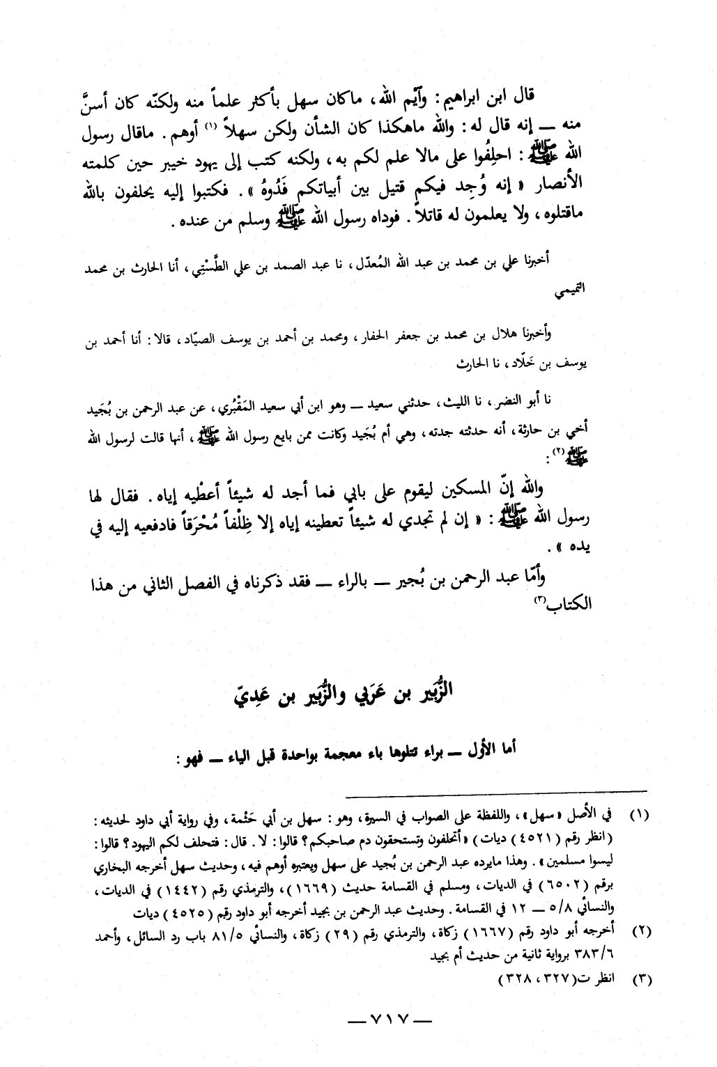 قَالَ ابْنُ إِبْرَاهِيمَ: وَايْمُ اللَّهِ، مَا كَانَ سَهْلٌ بِأَكْثَرِ عِلْمًا مِنْهُ وَلَكِنَّهُ كَانَ أَسَنَّ مِنْهُ، إِنَّهُ قَالَ لَهُ: وَاللَّهِ مَا هَكَذَا كَانَ الشَّأْنُ وَلَكِنَّ سَهْلا أُوهِمَ، مَا قَالَ رَسُولُ اللَّهِ صَلَّى اللَّهُ عَلَيْهِ وَسَلَّمَ: «احْلِفُوا عَلَى مَالا عِلْمَ لَكُمْ بِهِ، وَلَكِنَّهُ كَتَبَ إِلَى يَهُودِ خَيْبَرَ حِينَ كَلَّمَتْهُ الأَنْصَارُ، إِنَّهُ وُجِدَ فِيكُمْ قَتِيلٌ بَيْنَ أَبْيَاتِكُمْ فَدُوهُ، فَكَتَبُوا إِلَيْهِ يَحْلِفُونَ بِاللَّهِ مَا قَتَلُوهُ وَلا يَعْلَمُونَ لَهُ قَاتِلا، فَوَدَاهُ رَسُولُ اللَّهِ صَلَّى اللَّهُ عَلَيْهِ وَسَلَّمَ مِنْ عِنْدِهِ»