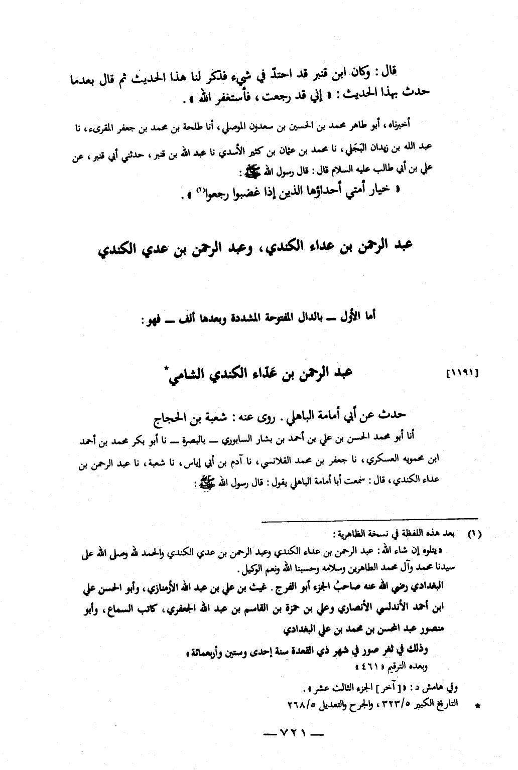 أَنَا أَبُو مُحَمَّدٍ الْحَسَنُ بْنُ عَلِيِّ بْنِ أَحْمَدَ بْنِ بَشَّارٍ السَّابُورِيُّ، بِالْبَصْرَةِ، نا أَبُو بَكْرٍ مُحَمَّدُ بْنُ أَحْمَدَ بْنِ مَحْمَوَيْهِ الْعَسْكَرِيُّ، نا جَعْفَرُ بْنُ مُحَمَّدٍ الْقَلانِسِيُّ، نا آدَمُ بْنُ أَبِي إِيَاسٍ، نا شُعْبَةُ، نا عَبْدُ الرَّحْمَنِ بْنُ عَدَّاءٍ الْكِنْدِيُّ، قَالَ: سَمِعْتُ أَبَا أُمَامَةَ الْبَاهِلِيَّ، يَقُولُ: قَالَ رَسُولُ اللَّهِ صَلَّى اللَّهُ عَلَيْهِ وَسَلَّمَ: