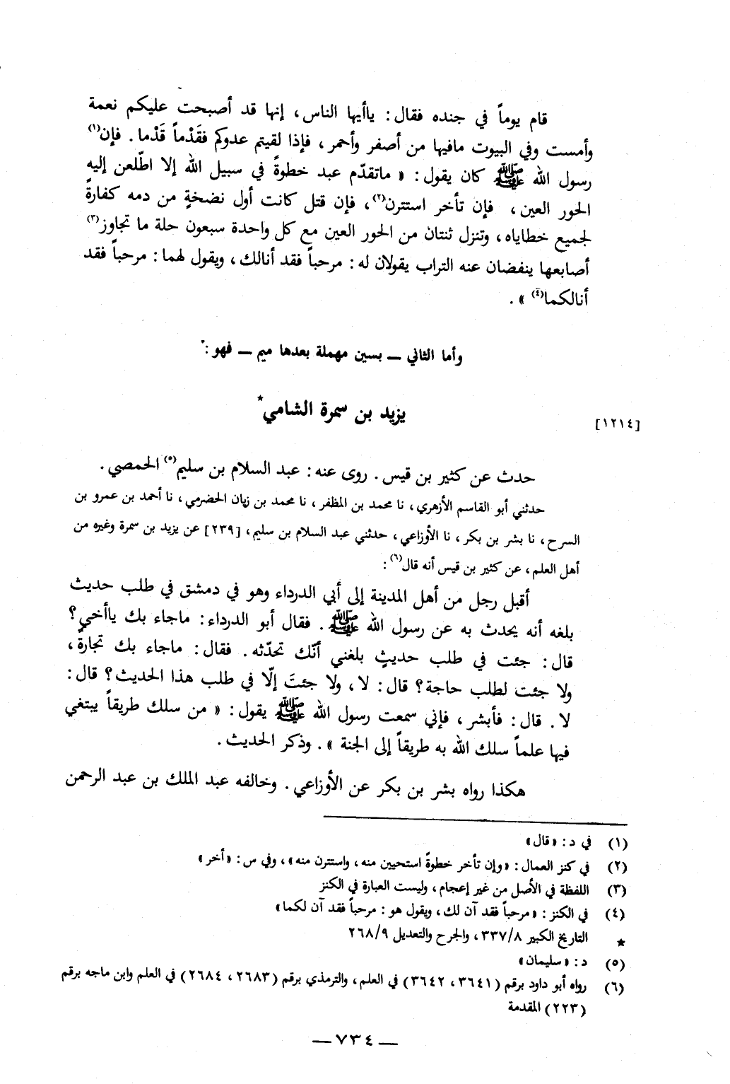 حَدَّثَنِي أَبُو الْقَاسِمِ الأَزْهَرِيُّ، نا مُحَمَّدُ بْنُ الْمُظَفَّرِ، نا مُحَمَّدُ بْنُ زَيَّانٍ الْحَضْرَمِيُّ، نا أَحْمَدُ بْنُ عَمْرِو بْنِ السَّرْحِ، نا بِشْرُ بْنُ بَكْرٍ، نا الأَوْزَاعِيُّ، حَدَّثَنِي عَبْدُ السَّلامِ بْنُ سُلَيْمٍ، عَنْ يَزِيدَ بْنِ سَمُرَةَ، وَغَيْرِهِ مِنْ أَهْلِ الْعِلْمِ، عَنْ كَثِيرِ بْنِ قَيْسٍ، أَنَّهُ قَالَ: أَقْبَلَ رَجُلٌ مِنْ أَهْلِ الْمَدِينَةِ إِلَى أَبِي الدَّرْدَاءِ وَهُوَ فِي دِمَشْقَ فِي طَلَبِ حَدِيثٍ بَلَغَهُ أَنَّهُ يُحَدِّثُ بِهِ عَنْ رَسُولِ اللَّهِ صَلَّى اللَّهُ عَلَيْهِ وَسَلَّمَ، فَقَالَ أَبُو الدَّرْدَاءِ: مَا جَاءَ بِكَ يَا أَخِي؟، قَالَ: جِئْتُ فِي طَلَبِ حَدِيثٍ بَلَغَنِي أَنَّكَ تُحَدِّثُهُ، فَقَالَ: مَا جَاءَ بِكَ تِجَارَةٌ، وَلا جِئْتَ لِطَلَبِ حَاجَةٍ؟، قَالَ: لا، وَلا جِئْتَ إِلَّا فِي طَلَبِ هَذَا الْحَدِيثِ؟، قَالَ: لا، قَالَ: فَأَبْشِرْ، فَإِنِّي سَمِعْتُ رَسُولَ اللَّهِ صَلَّى اللَّهُ عَلَيْهِ وَسَلَّمَ يَقُولُ: «مَنْ سَلَكَ طَرِيقًا يَبْتَغِي فِيهَا عِلْمًا سَلَكَ اللَّهُ بِهِ طَرِيقًا إِلَى الْجَنَّةِ»، وَذَكَرَ الْحَدِيثَ، هَكَذَا رَوَاهُ بِشْرُ بْنُ بَكْرٍ، عَنِ الأَوْزَاعِيِّ، وَخَالَفَهُ عَبْدُ الْمَلِكِ بْنُ عَبْدِ الرَّحْمَنِ
