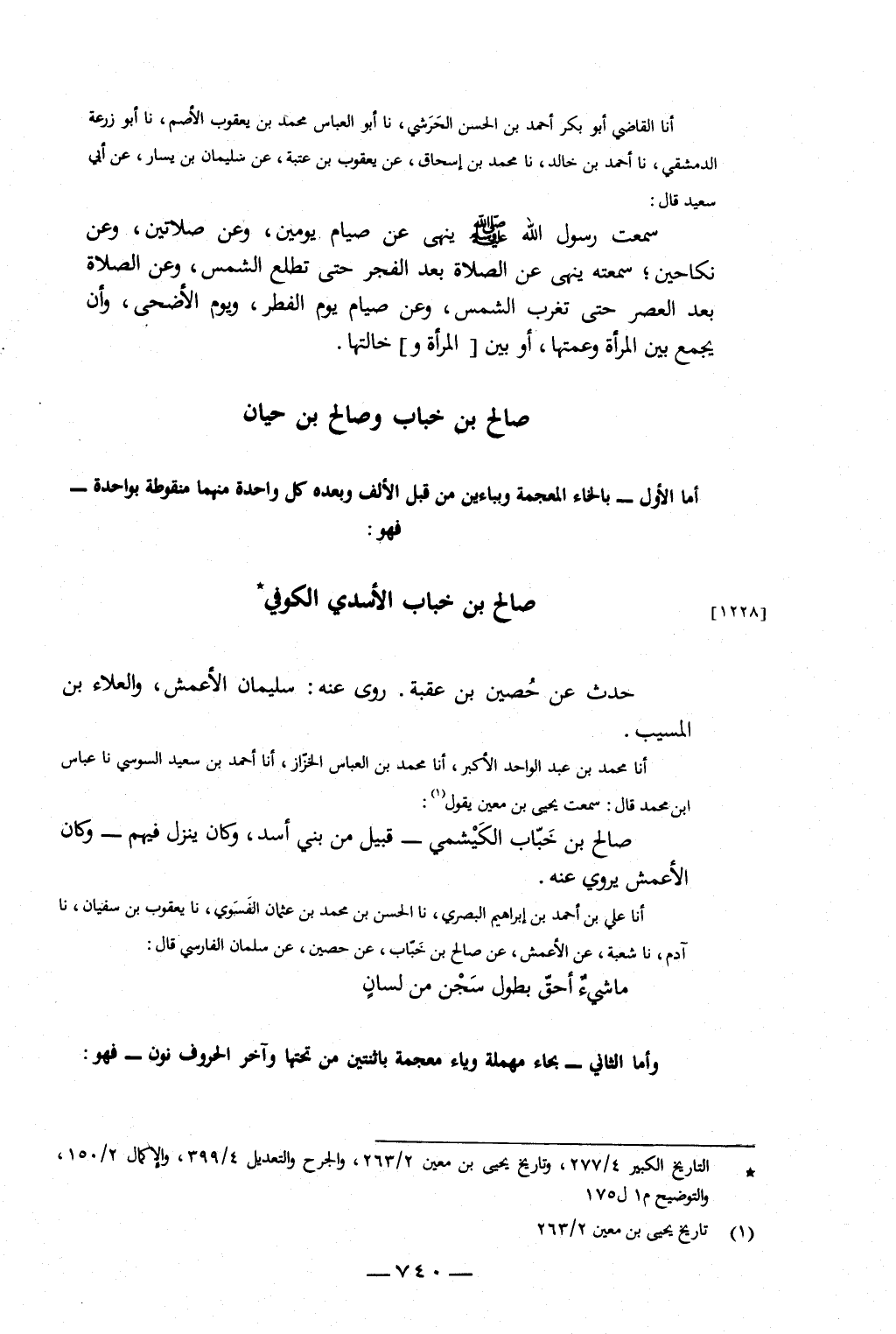 أَنَا مُحَمَّدُ بْنُ عَبْدِ الْوَاحِدِ الأَكْبَرُ، أَنَا مُحَمَّدُ بْنُ الْعَبَّاسِ الْخَزَّازُ، أَنَا أَحْمَدُ بْنُ سَعِيدٍ السُّوسِيُّ، نا عَبَّاسُ بْنُ مُحَمَّدٍ، قَالَ: سَمِعْتُ يَحْيَى بْنَ مَعِينٍ، يَقُولُ: «صَالِحُ بْنُ خَبَّابٍ الْكَيْشَمِيُّ قَبِيلٌ مِنْ بَنِي أَسَدٍ، وَكَانَ يَنْزِلُ فِيهِمْ، وَكَانَ الأَعْمَشُ يَرْوِي عَنْهُ»
