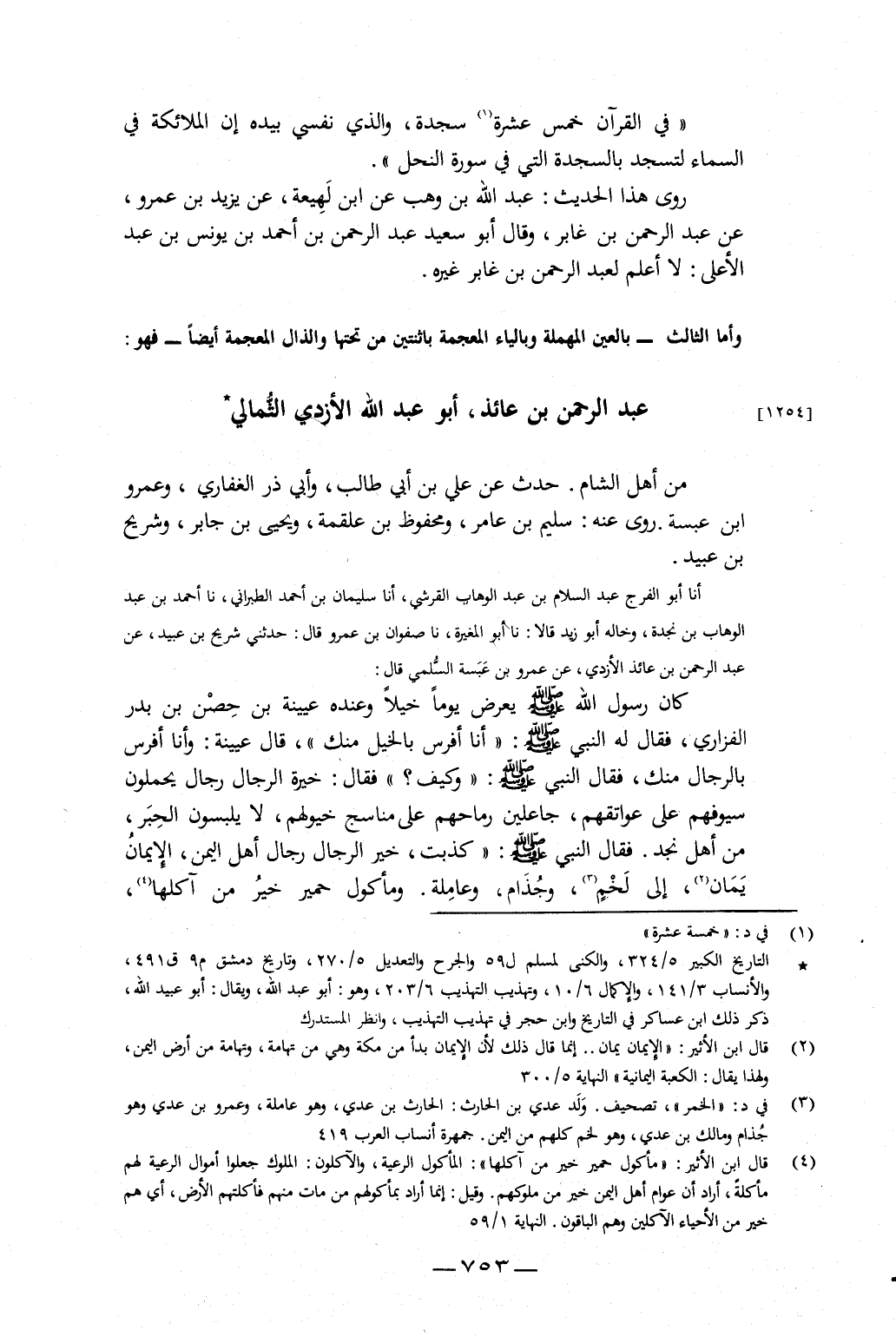 «فِي الْقُرْآنِ خَمْسَ عَشْرَةَ سَجْدَةٍ، وَالَّذِي نَفْسِي بِيَدِهِ إِنَّ الْمَلائِكَةَ فِي السَّمَاءِ لَتَسْجُدُ بِالسَّجْدَةِ الَّتِي فِي سُورَةِ النَّحْلِ»، رَوَى هَذَا الْحَدِيثَ عَبْدُ اللَّهِ بْنُ وَهْبٍ، عَنِ ابْنِ لَهِيعَةَ، عَنْ يَزِيدَ بْنِ عَمْرٍو، عَنْ عَبْدِ الرَّحْمَنِ بْنِ غَابِرٍ، قَالَ أَبُو سَعِيدٍ عَبْدُ الرَّحْمَنِ بْنُ أَحْمَدَ بْنِ يُونُسَ بْنِ عَبْدِ الأَعْلَى: لا أَعْلَمُ لِعَبْدِ الرَّحْمَنِ بْنِ غَابِرٍ غَيْرَهُ