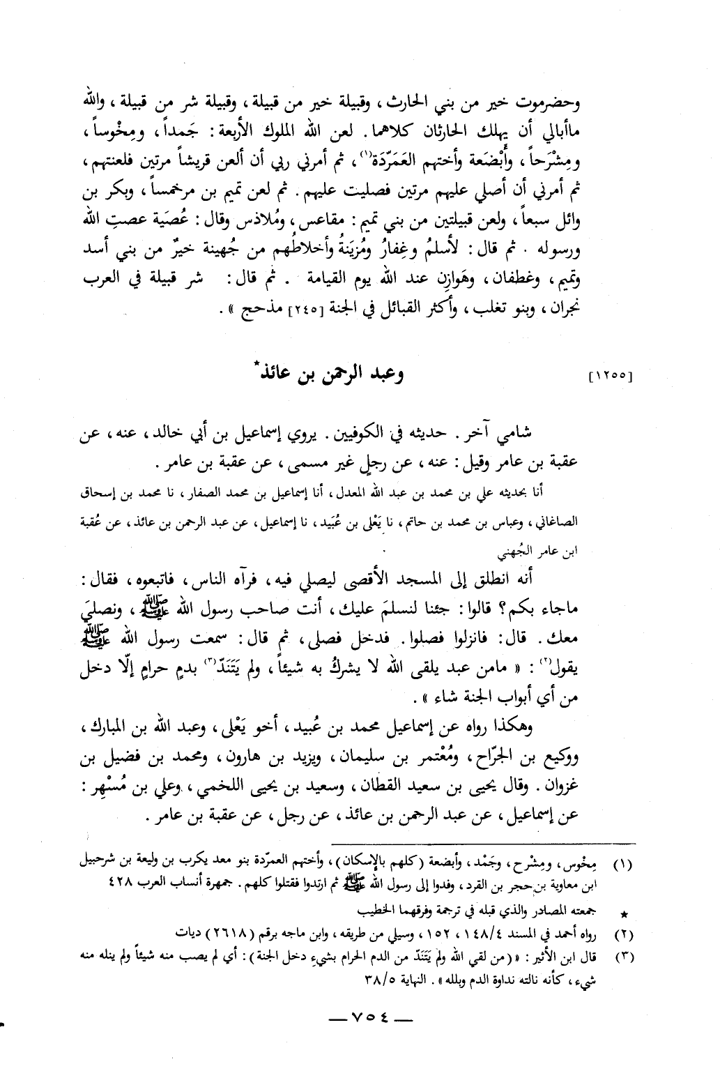أَنَا بِحَدِيثِهِ عَلِيُّ بْنُ مُحَمَّدِ بْنِ عَبْدِ اللَّهِ الْمُعَدَّلُ، أَنَا إِسْمَاعِيلُ بْنُ مُحَمَّدٍ الصَّفَّارُ، نا مُحَمَّدُ بْنُ إِسْحَاقَ الصَّاغَانِيُّ، وَعَبَّاسُ بْنُ مُحَمَّدِ بْنِ حَاتِمٍ، نا يَعْلَي بْنُ عُبَيْدٍ، نا إِسْمَاعِيلُ، عَنْ عَبْدِ الرَّحْمَنِ بْنِ عَائِذٍ، عَنْ عُقْبَةَ بْنِ عَامِرٍ الْجُهَنِيِّ، أَنَّهُ انْطَلَقَ إِلَى الْمَسْجِدِ الأَقْصَى لِيُصَلِّيَ فِيهِ، فَرَآهُ النَّاسُ، فَاتَّبَعُوهُ، فَقَالَ: مَا جَاءَ بِكُمْ؟، قَالُوا: جِئْنَا لِنُسَلِّمَ عَلَيْكَ، أَنْتَ صَاحِبُ رَسُولِ اللَّهِ صَلَّى اللَّهُ عَلَيْهِ وَسَلَّمَ، وَنُصَلِّيَ مَعَكَ، قَالَ: فَانْزِلُوا فَصَلُّوا، فَدَخَلَ فَصَلَّى، ثُمَّ قَالَ: سَمِعْتُ رَسُولَ اللَّهِ صَلَّى اللَّهُ عَلَيْهِ وَسَلَّمَ يَقُولُ: «مَا مِنْ عَبْدٍ يَلْقَى اللَّهَ لا يُشْرِكُ بِهِ شَيْئًا، وَلَمْ يَتَنَدَّ بِدَمٍ حَرَامٍ إِلَّا دَخَلَ مِنْ أَيِّ أَبْوَابِ الْجَنَّةِ شَاءَ».