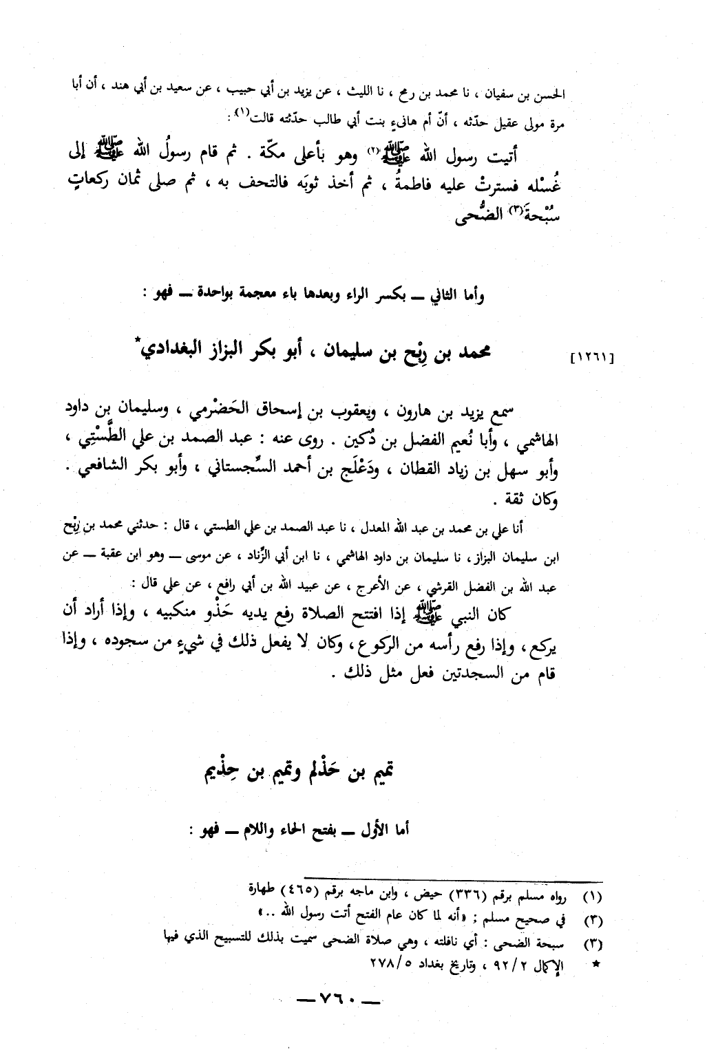الْحَسَنُ بْنُ سُفْيَانَ، نا مُحَمَّدُ بْنُ رُمْحٍ، نا اللَّيْثُ، عَنْ يَزِيدَ بْنِ أَبِي حَبِيبٍ، عَنْ سَعِيدِ بْنِ أَبِي هِنْدٍ، أَنَّ أَبَا مُرَّةَ مَوْلَى عُقَيْلٍ، حَدَّثَهُ، أَنَّ أُمَّ هَانِئٍ بِنْتَ أَبِي طَالِبٍ حَدَّثَتْهُ، قَالَتْ: «أَتَيْتُ رَسُولَ اللَّهِ صَلَّى اللَّهُ عَلَيْهِ وَسَلَّمَ وَهُوَ بِأَعْلَى مَكَّةَ، ثُمَّ قَامَ رَسُولُ اللَّهِ صَلَّى اللَّهُ عَلَيْهِ وَسَلَّمَ إِلَى غُسْلِهِ فَسَتَرَتْ عَلَيْهِ فَاطِمَةُ، ثُمَّ» أَخَذَ ثَوْبَهُ فَالْتَحَفَ بِهِ، ثُمَّ صَلَّى ثَمَانِ رَكْعَاتٍ سُبْحَةَ الضُّحَى "
