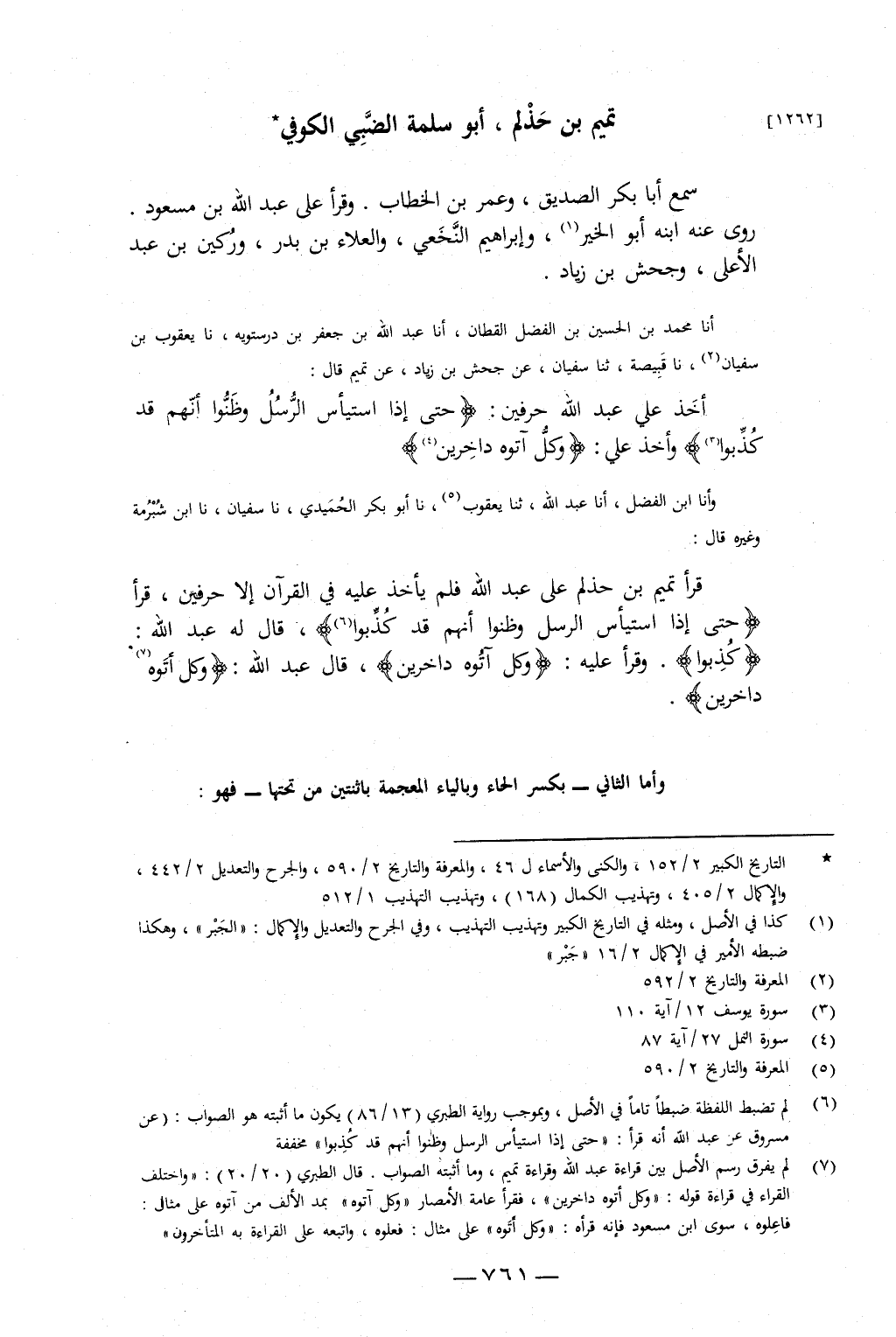 وَأَنَا ابْنُ الْفَضْلِ، أَنَا عَبْدُ اللَّهِ، ثنا يَعْقُوبُ، نا أَبُو بَكْرٍ الْحُمَيْدِيُّ، نا سُفْيَانُ، نا ابْنُ شُبْرُمَةَ وَغَيْرُهُ، قَالَ: قَرَأَ تَمِيمُ بْنُ حَذْلَمٍ عَلَى عَبْدِ اللَّهِ فَلَمْ يَأْخُذْ عَلَيْهِ فِي الْقُرْآنِ إِلَّا حَرْفَيْنِ، قَرَأَ: {حَتَّى إِذَا اسْتَيْأَسَ الرُّسُلُ وَظَنُّوا أَنَّهُمْ قَدْ كُذِبُوا} [يوسف: 110]، قَالَ لَهُ عَبْدُ اللَّهِ: «كُذِبُوا»، وَقَرَأَ عَلَيْهِ: {وَكُلٌّ أَتَوْهُ دَاخِرِينَ} [النمل: 87]، قَالَ عَبْدُ اللَّهِ: «وَكُلٌّ أتَوْهُ دَاخِرِينَ»
