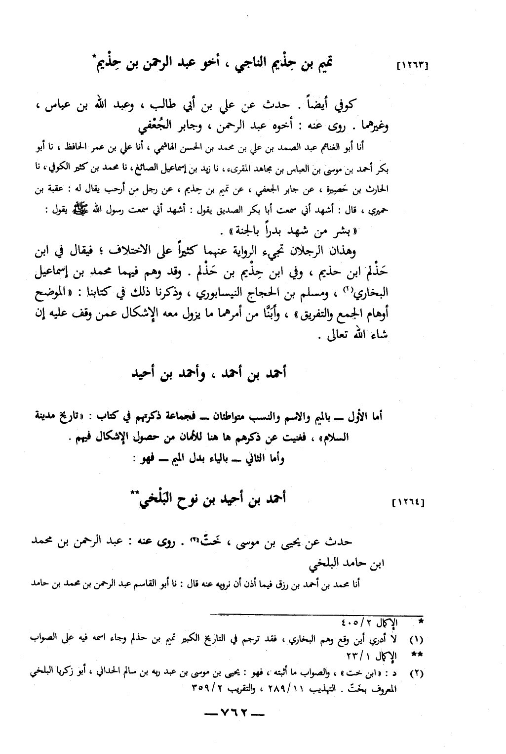 أَمَّا الأَوَّلُ بِالْمِيمِ وَبِالاسْمِ وَالنَّسَبِ مُتَوَاطِئَانِ، فَجَمَاعَةٌ ذَكَرْتُهُمْ فِي كِتَابِ تَارِيخِ مَدِينَةِ السَّلامِ، فَغَنِيتُ عَنْ ذِكْرِهِمَا هَاهُنَا لِلأَمَانِ مِنْ حُصُولِ الْإِشْكَالِ فِيهِمْ.