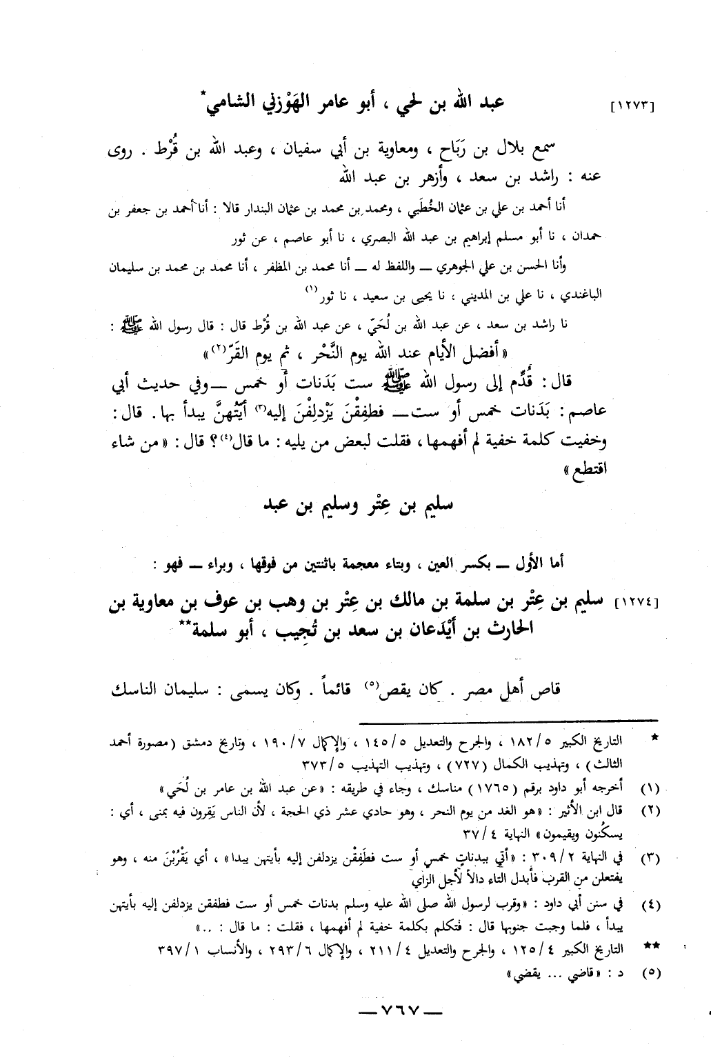 نا أَحْمَدُ بْنُ عَلِيِّ بْنِ عُثْمَانَ الْخُطَبِيُّ، وَمُحَمَّدُ بْنُ مُحَمَّدِ بْنِ عُثْمَانَ الْبُنْدَارُ، قَالا: أَنَا أَحْمَدُ بْنُ جَعْفَرِ بْنِ حَمْدَانَ، نا أَبُو مُسْلِمٍ إِبْرَاهِيمُ بْنُ عَبْدِ اللَّهِ الْبَصْرِيُّ، نا أَبُو عَاصِمٍ، عَنْ ثَوْرٍ، وَأَنَا الْحَسَنُ بْنُ عَلِيٍّ الْجَوْهَرِيُّ، وَاللَّفْظُ لَهُ، أَنَا مُحَمَّدُ بْنُ الْمُظَفَّرِ، أَنَا مُحَمَّدُ بْنُ مُحَمَّدِ بْنِ سُلَيْمَانَ الْبَاغِنْدِيُّ، نا عَلِيُّ بْنُ الْمَدِينِيِّ، نا يَحْيَى بْنُ سَعِيدٍ، نا ثَوْرٌ، نا رَاشِدُ بْنُ سَعْدٍ، عَنْ عَبْدِ اللَّهِ بْنِ لُحَيٍّ، عَنْ عَبْدِ اللَّهِ بْنِ قُرْطٍ، قَالَ: قَالَ رَسُولُ اللَّهِ صَلَّى اللَّهُ عَلَيْهِ وَسَلَّمَ: «أَفْضَلُ الأَيَّامِ عِنْدَ اللَّهِ يَوْمُ النَّحْرِ، ثُمَّ يَوْمُ الْقَرِّ»، قَالَ: قُدِّمَ إِلَى رَسُولِ اللَّهِ صَلَّى اللَّهُ عَلَيْهِ وَسَلَّمَ سِتُّ بَدَنَاتٍ أَوْ خَمْسٌ، وَفِي حَدِيثِ أَبِي عَاصِمٍ: بَدَنَاتٌ خَمْسٌ أَوْ سِتٌّ، فَطفِقْنَ يَزْدَلِفْنَ إِلَيْهِ أَيَّتُهُنَّ يَبْدَأُ بِهَا، قَالَ: وَخَفِيَتْ كَلِمَةٌ خَفِيَّةٌ لَمْ أَفْهَمْهَا، فَقُلْتُ لِبَعْضِ مَنْ يَلِيهِ: مَا قَالَ؟، قَالَ: «مَنْ شَاءَ اقْتَطَعَ»