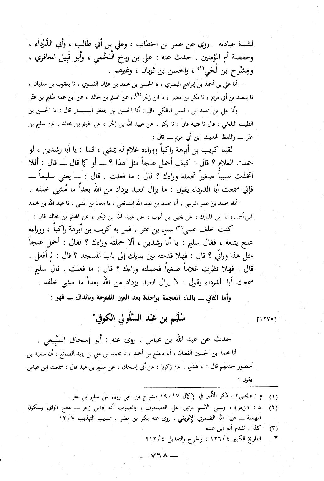 أَنَا عَلِيُّ بْنُ أَحْمَدَ بْنِ إِبْرَاهِيمَ الْبَصْرِيِّ، نا الْحَسَنُ بْنُ مُحَمَّدِ بْنِ عُثْمَانَ الْفَسَوِيُّ، نا يَعْقُوبُ بْنُ سُفْيَانَ، نا سَعِيدُ بْنُ أَبِي مَرْيَمَ، نا بَكْرُ بْنُ مُضَرٍ، نا ابْنُ زَحْرٍ، عَنِ الْهَيْثَمِ بْنِ خَالِدٍ، عَنِ ابْنِ عَمِّهِ سُلَيْمِ بْنِ عِتْرٍ، وَأَنَا عَلِيُّ بْنُ مُحَمَّدِ بْنِ الْحَسَنِ الْمَالِكِيُّ، قَالَ: أَنَا الْحَسَنُ بْنُ جَعْفَرٍ السِّمْسَارُ، قَالَ: نا الْحَسَنُ بْنُ الطَّيِّبِ الْبَلْخِيُّ، وَقَالَ نا قُتَيْبَةُ، قَالَ: عَنْ عُبَيْدِ اللَّهِ بْنِ زَحْرٍ، عَنِ الْهَيْثَمِ بْنِ خَالِدٍ، عَنْ سُلَيْمِ بْنِ عِتْرٍ، وَاللَّفْظُ لِحَدِيثِ ابْنِ أَبِي مَرْيَمَ، قَالَ: لَقِيَنَا كُرَيْبُ بْنُ أَبْرَهَةَ رَاكِبًا وَوَرَاءَهُ غُلامٌ لَهُ يَمْشِي، قُلْنَا: يَا أَبَا رِشْدِينَ، لَوْ حَمَلْتَ الْغُلامَ؟، قَالَ: كَيْفَ أَحْمِلُ عِلْجًا مِثْلَ هَذَا؟ أَوْ قَالَ: كَمَا قَالَ: أَفَلا اتَّخَذْتَ صَبِيًّا صَغِيرًا تَحْمِلُهُ وَرَاءَكَ؟، قَالَ: مَا فَعَلْتُ؟، قَالَ: يَعْنِي سُلَيْمًا فَإِنِّي سَمِعْتُ أَبَا الدَّرْدَاءِ، يَقُولُ: «مَا يَزَالُ الْعَبْدُ يَزْدَادُ مِنَ اللَّهِ بُعْدًا مَا مُشِيَ خَلْفَهُ»