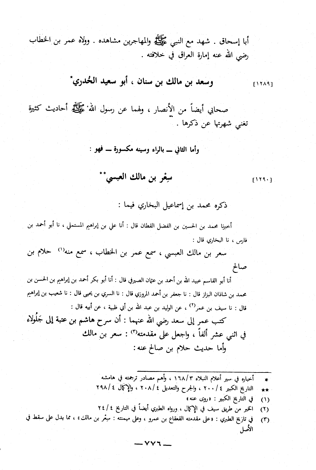 ذَكَرَهُ مُحَمَّدُ بْنُ إِسْمَاعِيلَ الْبُخَارِيُّ فِيمَا: أَخْبَرَنَا مُحَمَّدُ بْنُ الْحُسَيْنِ بْنِ الْفَضْلِ الْقَطَّانُ، قَالَ: أَنَا عَلِيُّ بْنُ إِبْرَاهِيمَ الْمُسْتَمْلِيُّ، نا أَبُو أَحْمَدَ بْنُ فَارِسٍ، نا الْبُخَارِيُّ، قَالَ: سِعْرُ بْنُ مَالِكٍ الْعَبْسِيُّ، سَمِعَ عُمَرَ بْنَ الْخَطَّابِ، سَمِعَ مِنْهُ حَلَّامُ بْنُ صَالِحٍ.