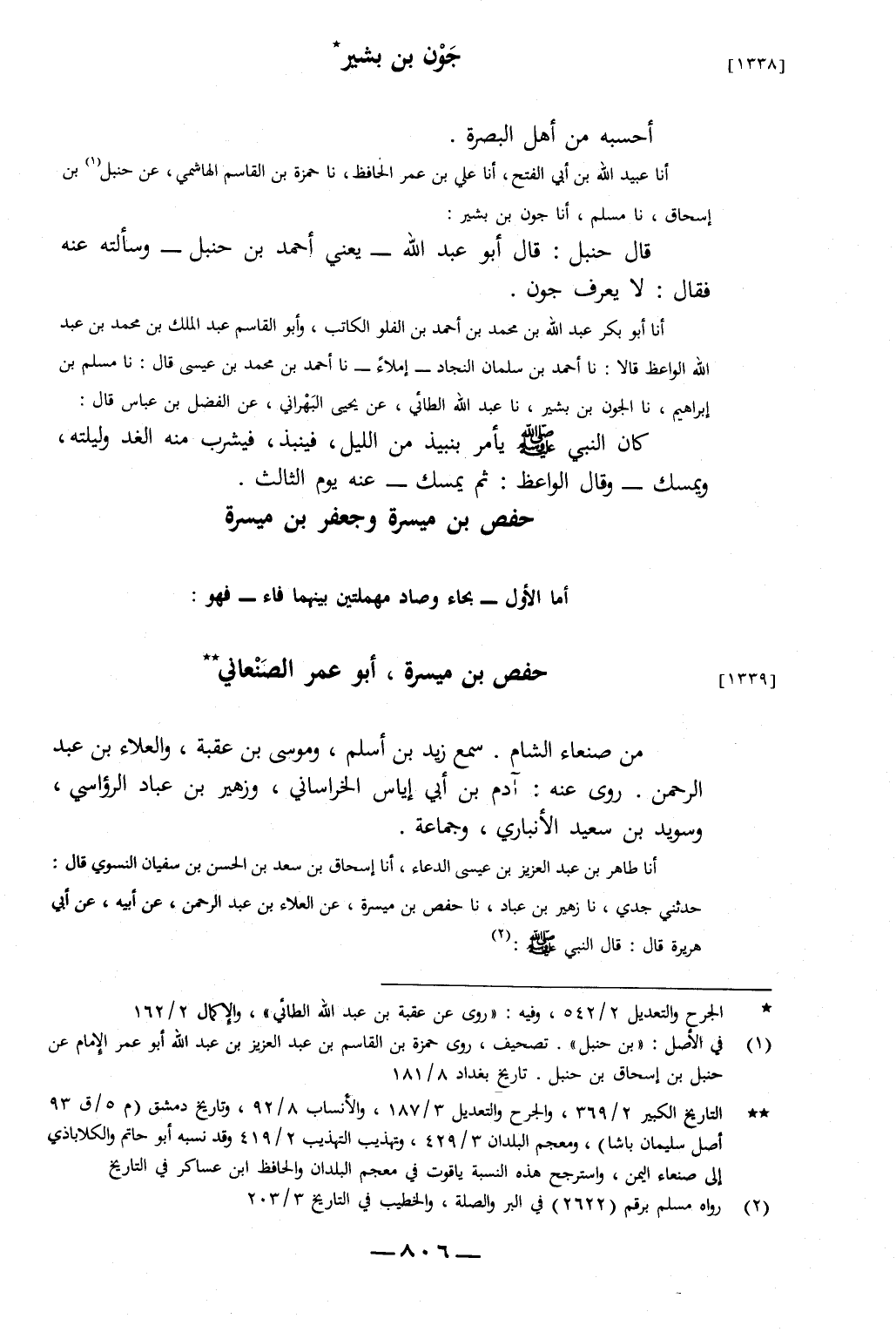 أَنَا عُبَيْدُ اللَّهِ بْنُ أَبِي الْفَتْحِ، أَنَا عَلِيُّ بْنُ عُمَرَ الْحَافِظُ، نا حَمْزَةُ بْنُ الْقَاسِمِ الْهَاشِمِيُّ، عَنْ حَنْبَلِ بْنِ إِسْحَاقَ، نا مُسْلِمٌ، أَنَا جَوْنُ بْنُ بَشِيرٍ: قَالَ حَنْبَلٌ: قَالَ أَبُو عَبْدِ اللَّهِ يَعْنِي أَحْمَدَ بْنَ حَنْبَلٍ: " وَسَأَلْتُهُ عَنْهُ، فَقَالَ: لا يُعْرَفُ جَوْنٌ