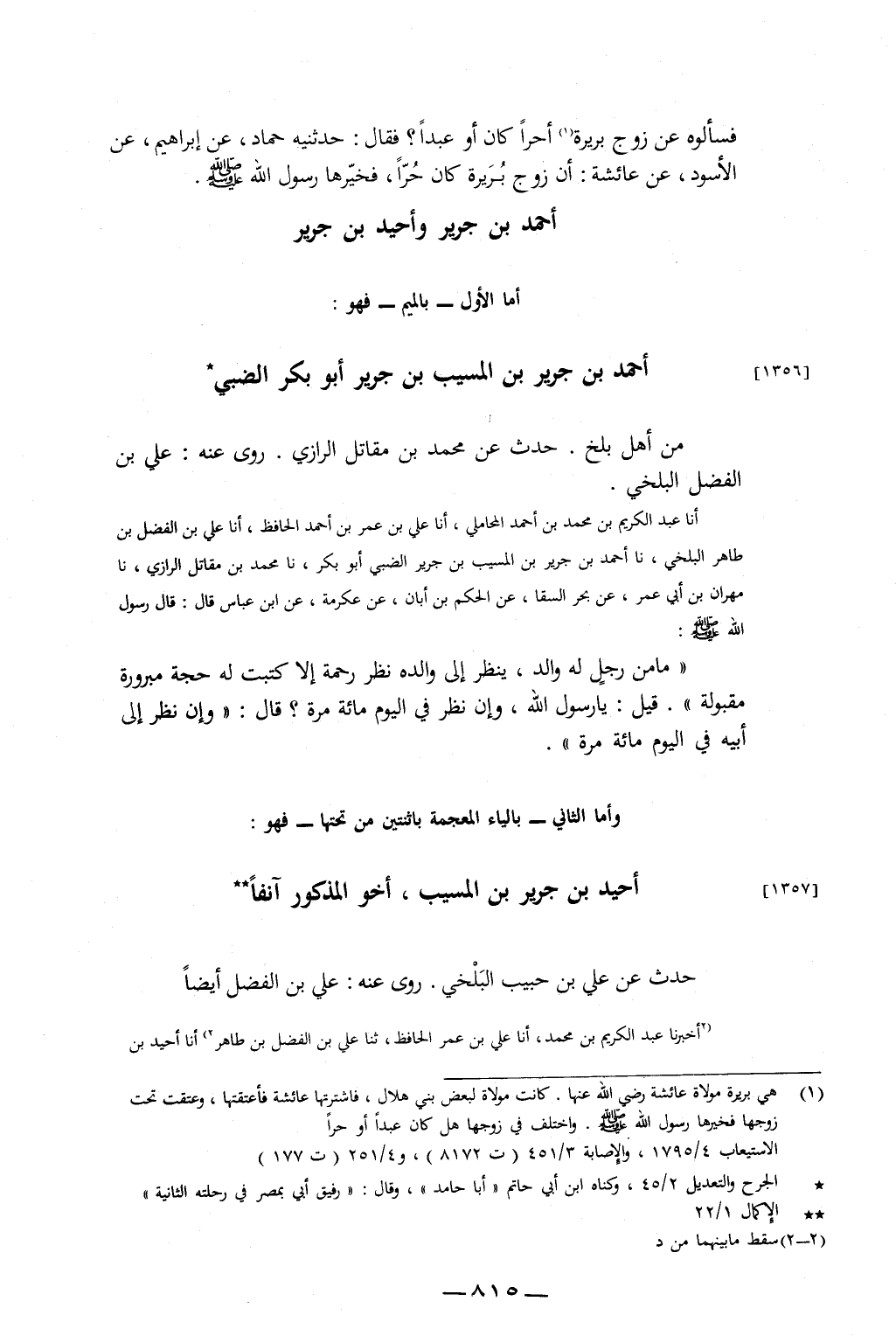 أَنَا عَبْدُ الْكَرِيمِ بْنُ مُحَمَّدِ بْنِ أَحْمَدَ الْمَحَامِلِيُّ، أَنَا عَلِيُّ بْنُ عُمَرَ بْنِ أَحْمَدَ الْحَافِظُ، أَنَا عَلِيُّ بْنُ الْفَضْلِ بْنِ طَاهِرٍ الْبَلْخِيُّ، نا أَحْمَدُ بْنُ جَرِيرِ بْنِ الْمُسَيِّبِ بْنِ جَرِيرٍ الضَّبِّيُّ أَبُو بَكْرٍ، نا مُحَمَّدُ بْنُ مُقَاتِلٍ الرَّازِيُّ، نا مِهْرَانُ بْنُ أَبِي عُمَرَ، عَنْ بَحْرٍ السَّقَّا، عَنِ الْحَكَمِ بْنِ أَبَانٍ، عَنْ عِكْرِمَةَ عَنِ ابْنِ عَبَّاسٍ، قَالَ: قَالَ رَسُولُ اللَّهِ صَلَّى اللَّهُ عَلَيْهِ وَسَلَّمَ: «مَا مِنْ رَجُلٍ لَهُ وَالِدٌ، يَنْظُرُ إِلَى وَالِدِهِ نَظَرَ رَحْمَةٍ إِلَّا كُتِبَتْ لَهُ حَجَّةٌ مَبْرُورَةٌ مَقْبُولَةٌ»، قِيلَ: يَا رَسُولَ اللَّهِ، وَإِنْ نَظَرَ فِي الْيَوْمِ مِائَةَ مَرَّةٍ؟، قَالَ: «وَإِنْ نَظَرَ إِلَى أَبِيهِ فِي الْيَوْمِ مِائَةَ مَرَّةٍ»