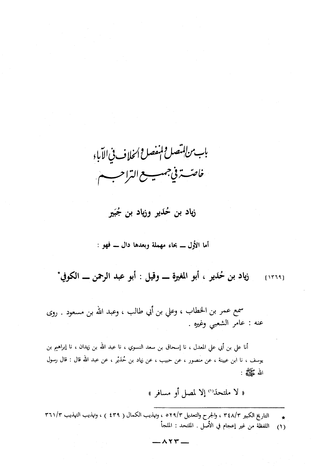أَنَا عَلِيُّ بْنُ أَبِي عَلِيٍّ الْمُعَدَّلُ، نا إِسْحَاقُ بْنُ سَعْدٍ النَّسَوِيُّ، نا عَبْدُ اللَّهِ بْنُ زَيْدَانَ، نا إِبْرَاهِيمُ بْنُ يُوسُفَ، نا ابْنُ عُيَيْنَةَ، عَنْ مَنْصُورٍ، عَنْ حَبِيبٍ، عَنْ زِيَادِ بْنِ حُدَيْرٍ، عَنْ عَبْدِ اللَّهِ، قَالَ: قَالَ رَسُولُ اللَّهِ صَلَّى اللَّهُ عَلَيْهِ وَسَلَّمَ: «لا مُلْتَحَدَ إِلَّا لِمُصَلٍّ أَوْ مُسَافِرٍ»
