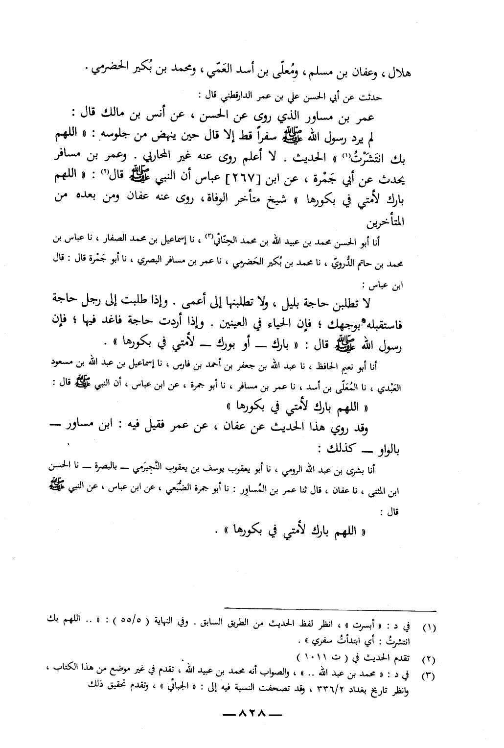 أَنَا بِشْرِيُّ بْنُ عَبْدِ اللَّهِ الرُّومِيُّ، نا أَبُو يَعْقُوبَ يُوسُفُ بْنُ يَعْقُوبَ النَّجِيرَمِيُّ، بِالْبَصْرَةِ، نا الْحَسَنُ بْنُ الْمُثَنَّى، نا عَفَّانُ، قَالَ: ثنا عُمَرُ بْنُ الْمُسَاوِرِ، نا أَبُو جَمْرَةَ الضُّبَعِيُّ، عَنِ ابْنِ عَبَّاسٍ، عَنِ النَّبِيِّ صَلَّى اللَّهُ عَلَيْهِ وَسَلَّمَ قَالَ: «اللَّهُمَّ بَارِكْ لِأُمَّتِي فِي بُكُورِهَا»