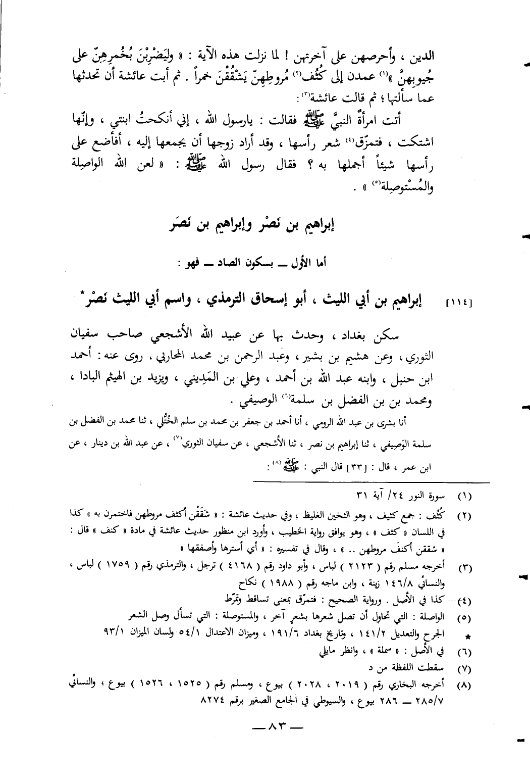 الدِّينِ، وَأَحْرَصَهِنَّ عَلَى آخَرَتِهِنَّ! لَمَّا نَزَلَتْ هَذِهِ الآيَةُ {وَلْيَضْرِبْنَ بِخُمُرِهِنَّ عَلَى جُيُوبِهِنَّ} [النور: 31] عَمَدْنَ إِلَى كُثُفِ مُرُوطِهِنَّ يَشْقُقْنَ خُمُرًا، ثُمَّ أَبَتْ عَائِشَةُ أَنْ تُحَدِّثَهَا عَمَّا سَأَلَتْهَا، ثُمَّ قَالَتْ عَائِشَةُ: أَتَتِ امْرَأَةٌ النَّبِيَّ صَلَّى اللَّهُ عَلَيْهِ وَسَلَّمَ فَقَالَتْ: يَا رَسُولَ اللَّهِ، إِنِّي أَنْكَحْتُ ابْنَتِي، وَإِنَّهَا اشْتَكَتْ، فَتَمَزَّقَ شَعْرُ رَأْسِهَا، وَقَدْ أَرَادَ زَوْجَهَا أَنْ يَجْمَعَهَا إِلَيْهِ، أَفَأَضَعْ عَلَى رَأْسِهَا شَيْئًا أُجَمِّلُهَا بِهِ؟ فَقَالَ رَسُولُ اللَّهِ صَلَّى اللَّهُ عَلَيْهِ وَسَلَّمَ: «لَعَنَ اللَّهُ الْوَاصِلَةَ وَالْمُسْتَوْصِلَةَ»