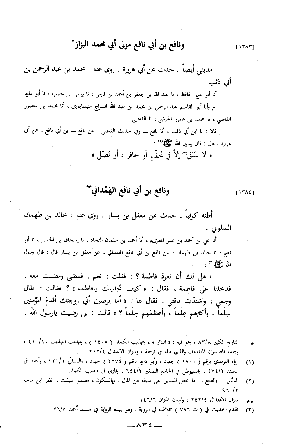 أَنَا عَلِيُّ بْنُ أَحْمَدَ بْنِ عُمَرَ الْمُقْرِيُّ، أَنَا أَحْمَدُ بْنُ سَلْمَانَ النَّجَّادُ، نا إِسْحَاقُ بْنُ الْحَسَنِ، نا أَبُو نُعَيْمٍ، نا خَالِدُ بْنُ طَهْمَانَ، عَنْ نَافِعِ بْنِ أَبِي نَافِعٍ الْهَمْدَانِيِّ، عَنْ مَعْقِلِ بْنِ يَسَارٍ، قَالَ: قَالَ رَسُولُ اللَّهِ صَلَّى اللَّهُ عَلَيْهِ وَسَلَّمَ: «هَلْ لَكَ أَنْ نَعُودَ فَاطِمَةَ»، فَقُلْتُ: نَعَمْ، فَمَضَى وَمَضَيْتُ مَعَهُ، فَدَخَلْنَا عَلَى فَاطِمَةَ، فَقَالَ: «كَيْفَ تَجِدِينَكِ يَا فَاطِمَةُ؟»، فَقَالَتْ: طَالَ وَجَعِي، وَاشْتَدَّتْ فَاقَتِي، فَقَالَ لَهَا: «أَمَا تَرْضِينَ أَنِّي زَوَّجْتُكِ أَقْدَمَ الْمُؤْمِنِينَ سِلْمًا، وَأَكْثَرَهُمْ عِلْمًا، وَأَعْظَمَهُمْ، حِلْمًا؟»، قَالَتْ: بَلَى، رَضِيتُ يَا رَسُولَ اللَّهِ