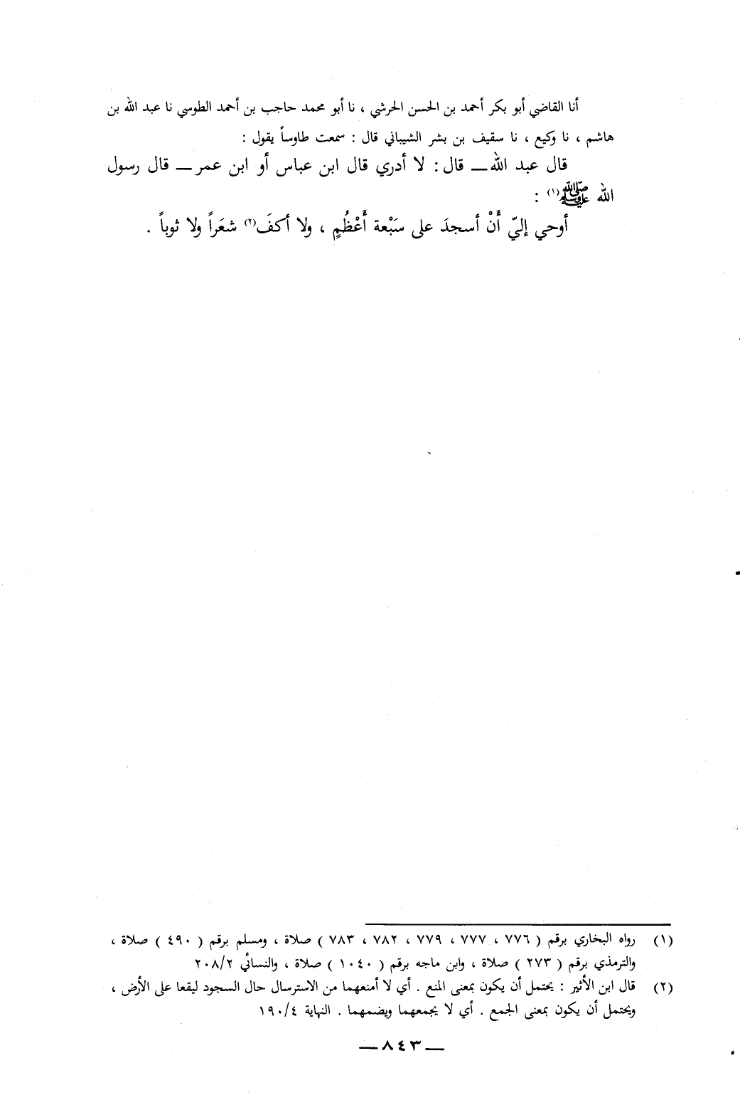 أَنَا الْقَاضِي أَبُو بَكْرٍ أَحْمَدَ بْنُ الْحَسَنِ الْحِرَشِيُّ، نا أَبُو مُحَمَّدٍ حَاجِبُ بْنُ أَحْمَدَ الطُّوسِيُّ، نا عَبْدُ اللَّهِ بْنُ هَاشِمٍ، نا وَكِيعٌ، نا سُقَيْفُ بْنُ بِشْرٍ الشَّيْبَانِيُّ، قَالَ: سَمِعْتُ طَاوُسًا، يَقُولُ: قَالَ عَبْدُ اللَّهِ، قَالَ ابْنُ عَبَّاسٍ أَوِ ابْنُ عُمَرَ: قَالَ رَسُولُ اللَّهِ صَلَّى اللَّهُ عَلَيْهِ وَسَلَّمَ: «أُوحِيَ إِلَيَّ أَنْ أَسْجُدَ عَلَى سَبْعَةِ أَعْظُمٍ، وَلا أَكُفَّ شَعْرًا وَلا ثَوْبًا»